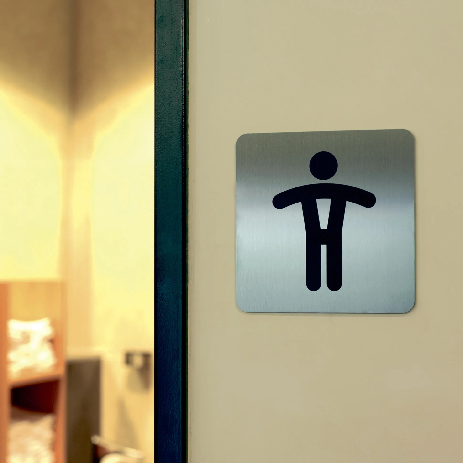 Firkantet skilt WC Herretoilet Symbolskilt af børstet rustfrit stål, der er ridsefri. Stort synligt skilt. Selvklæbende puder medfølger. Mål: 150 x 150 mm