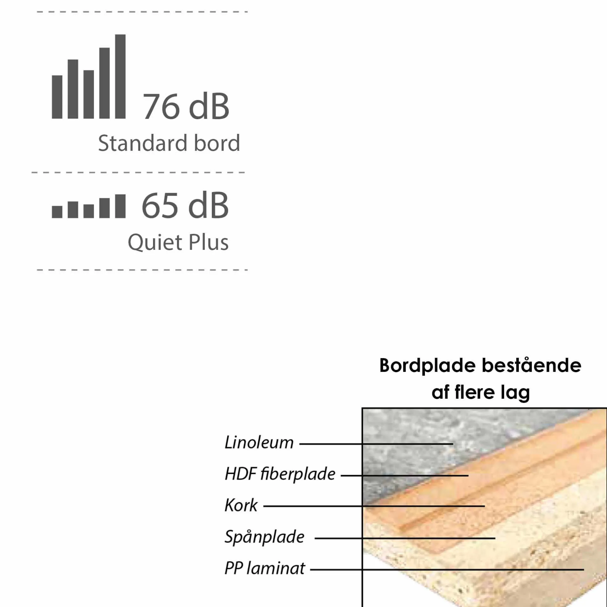 Den særlige bordplade som kan dæmpe lydniveauet med op til 11 db (fra 76 dB ved et standardbord til 65 dB). Det kan være ved leg med klodser, puslespil eller fra tallerkner mm. som larmer på bordpladen. Bordpladen består af 5 lag for at skabe den lyddæmpende effekt: øverst linoleum, så HDF fiberplade, kork, spånplade og som underside PP (polypropylene) laminat.