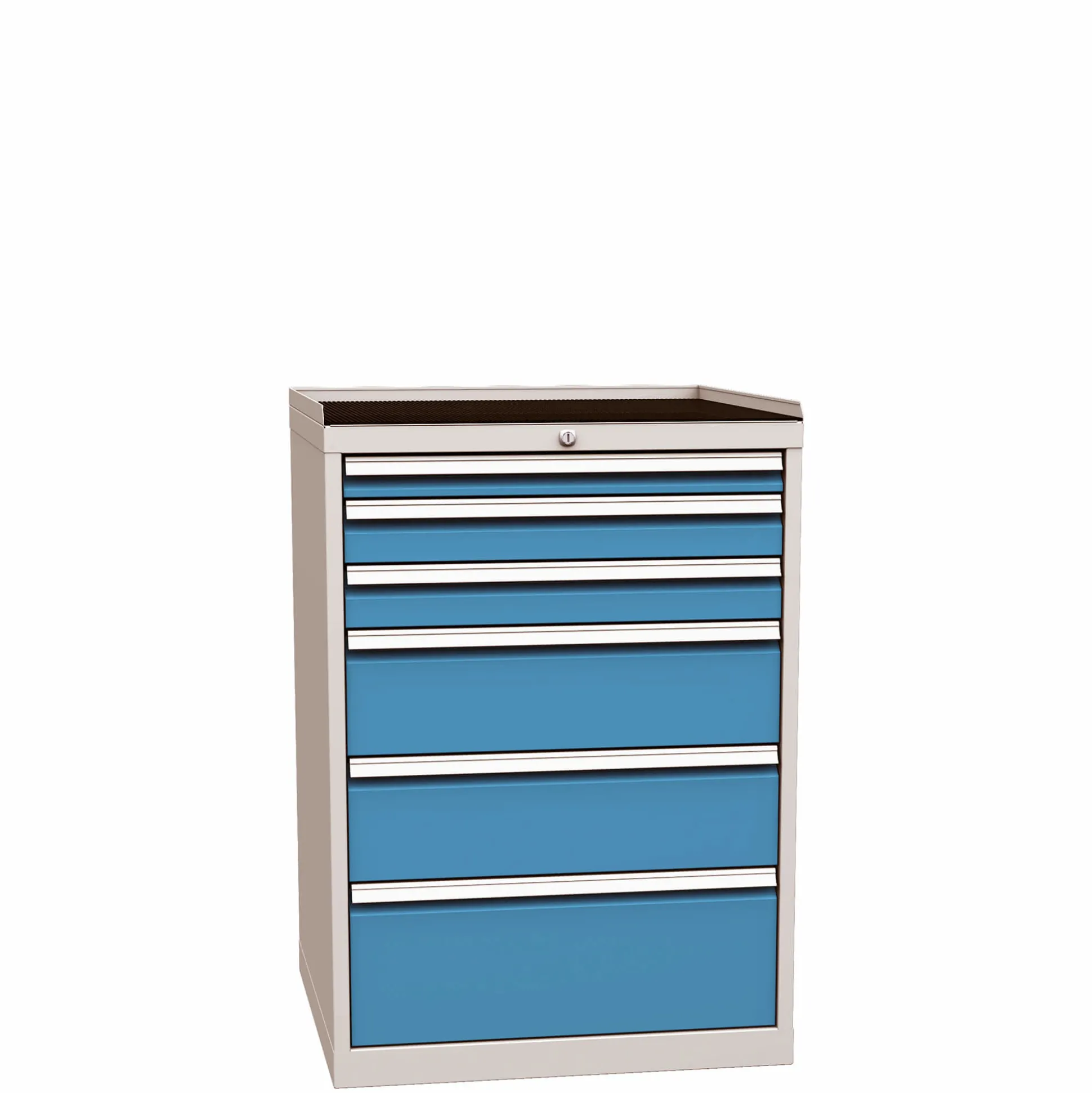 Værktøjsskab i kraftig kvalitet, der tåler daglig brug og samtidig sikrer lang levetid. Skabet indeholder: – 6 skuffer – Centrallås – Topplade med skridsikker gummibelægning Skabet leveres med gråt kabinet og skuffer/låger i blå.