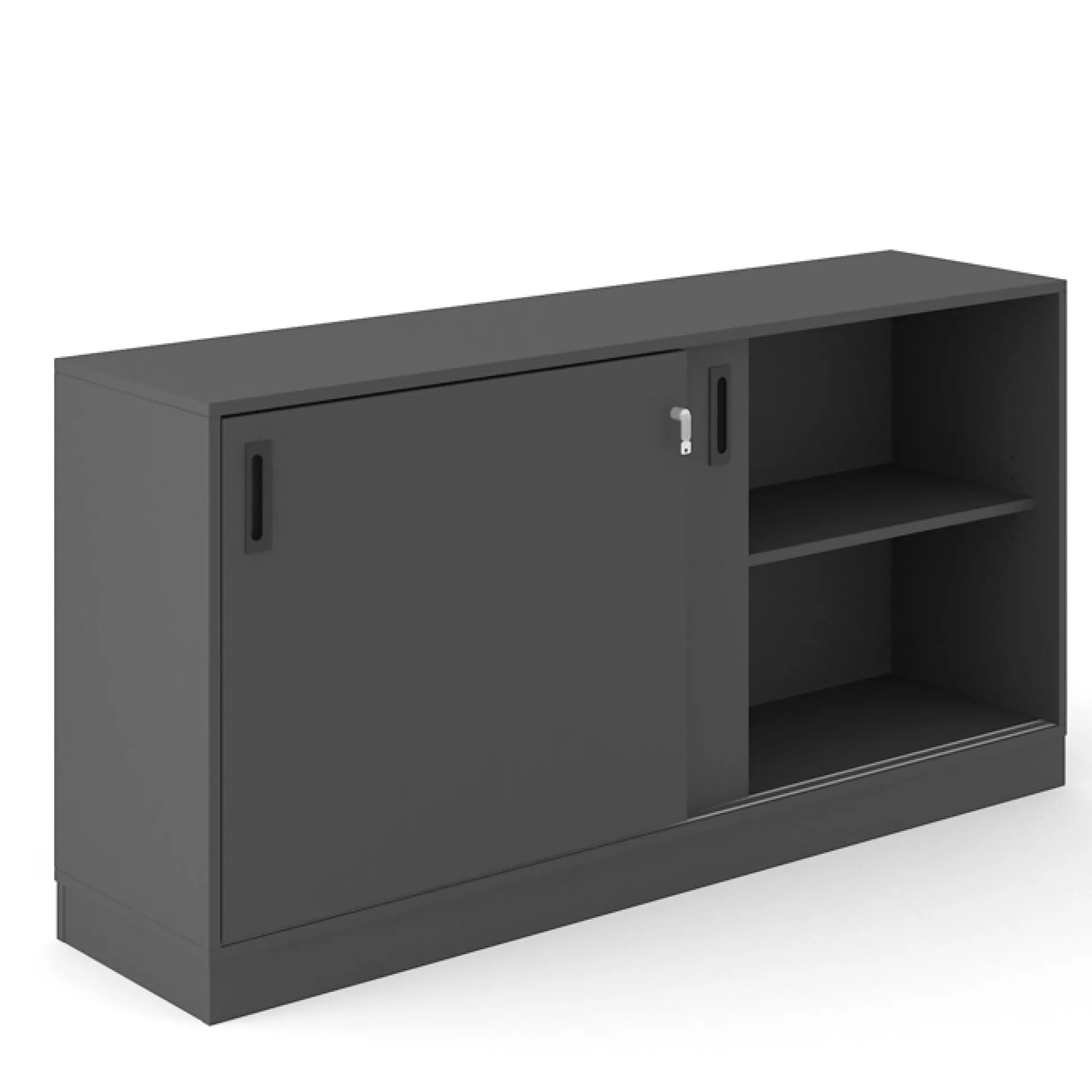 New Choice skydedørsskab med 4 rum og skydelåger med lås. Skabet er udført i slidstærk decor laminat, og fås i flere forskellige størrelser. Det er perfekt til opbevaring af diverse mapper og andet, og fungerer også som rumdeler imellem arbejdspladser. Skydedørsskabet fås i antracit, hvid eller eg.