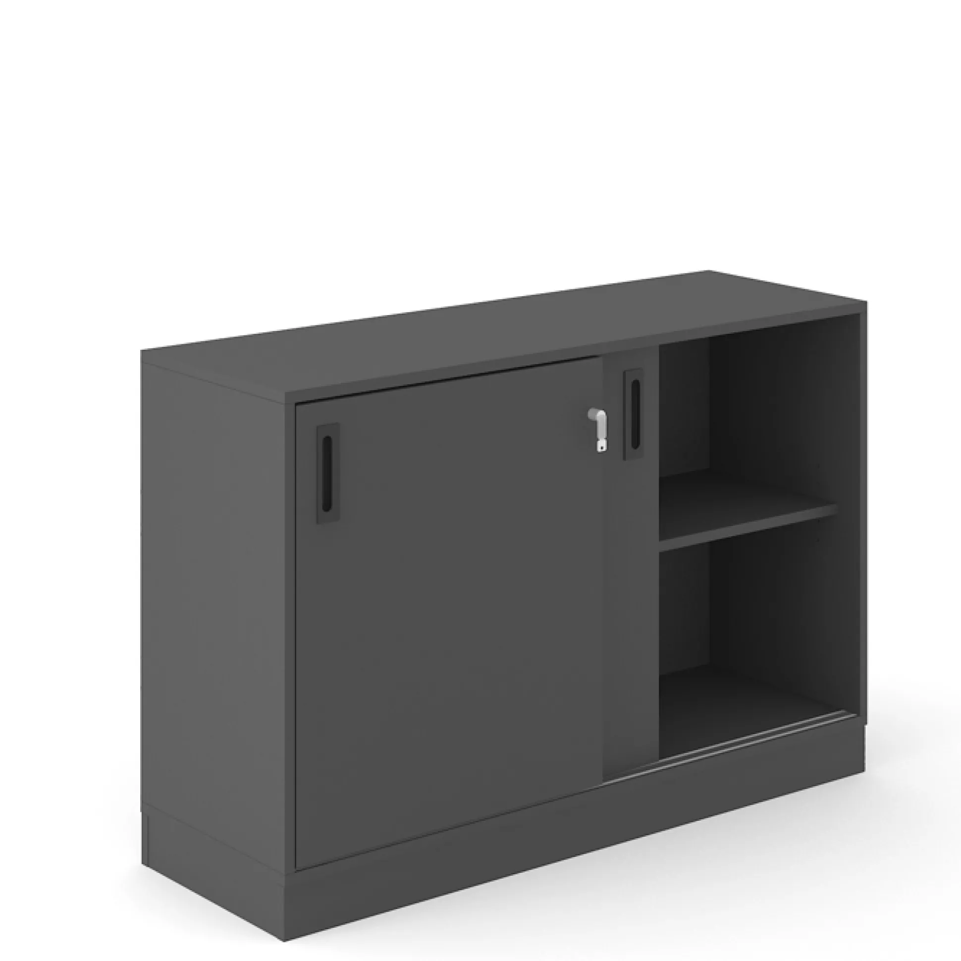 New Choice skydedørsskab med 4 rum og skydelåger med lås. Skabet er udført i slidstærk decor laminat, og fås i flere forskellige størrelser. Det er perfekt til opbevaring af diverse mapper og andet, og fungerer også som rumdeler imellem arbejdspladser. Skydedørsskabet fås i antracit, hvid eller eg.