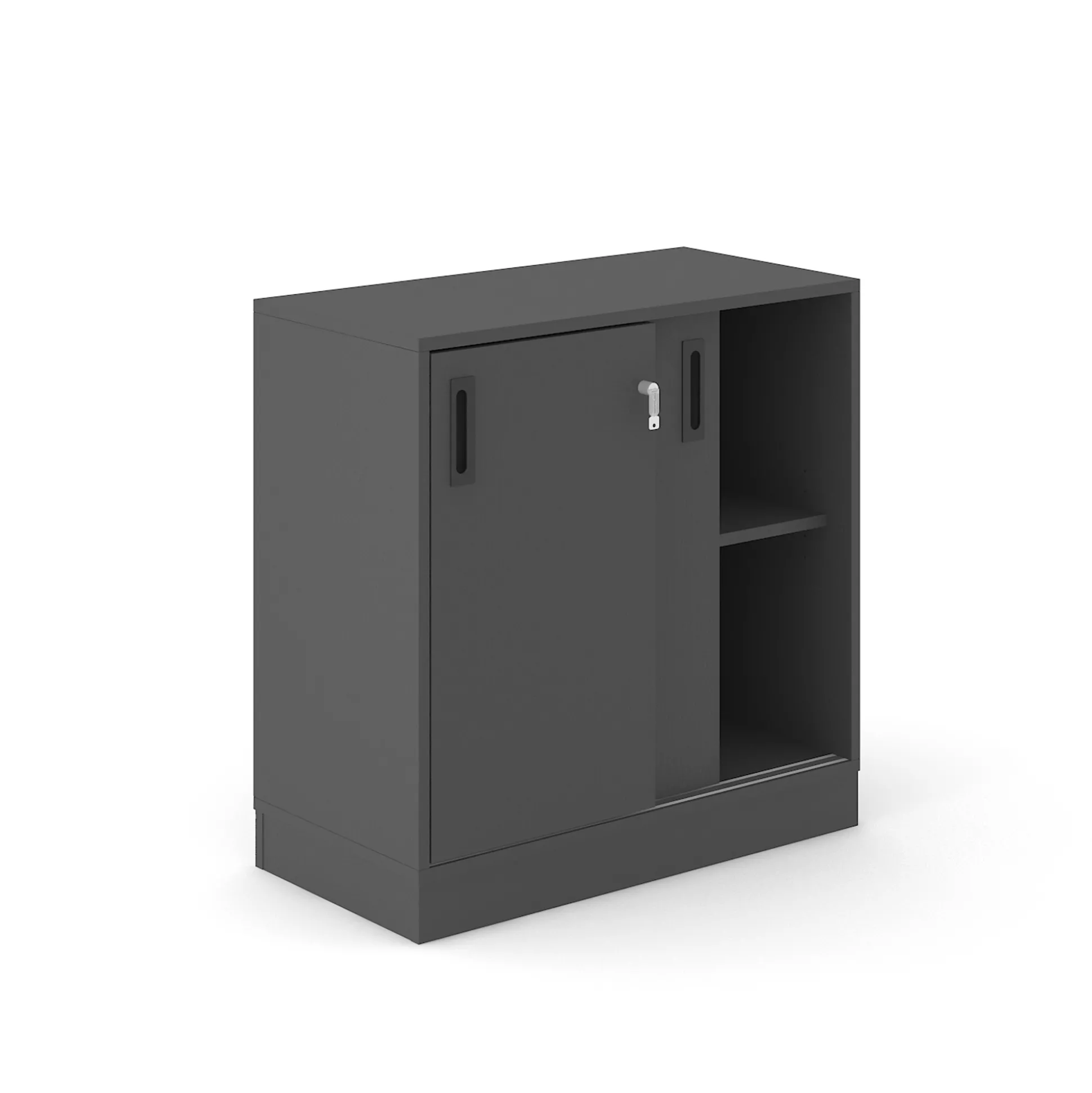 New Choice skydedørsskab med 4 rum og skydelåger med lås. Skabet er udført i slidstærk decor laminat, og fås i flere forskellige størrelser. Det er perfekt til opbevaring af diverse mapper og andet, og fungerer også som rumdeler imellem arbejdspladser. Skydedørsskabet fås i antracit, hvid eller eg.