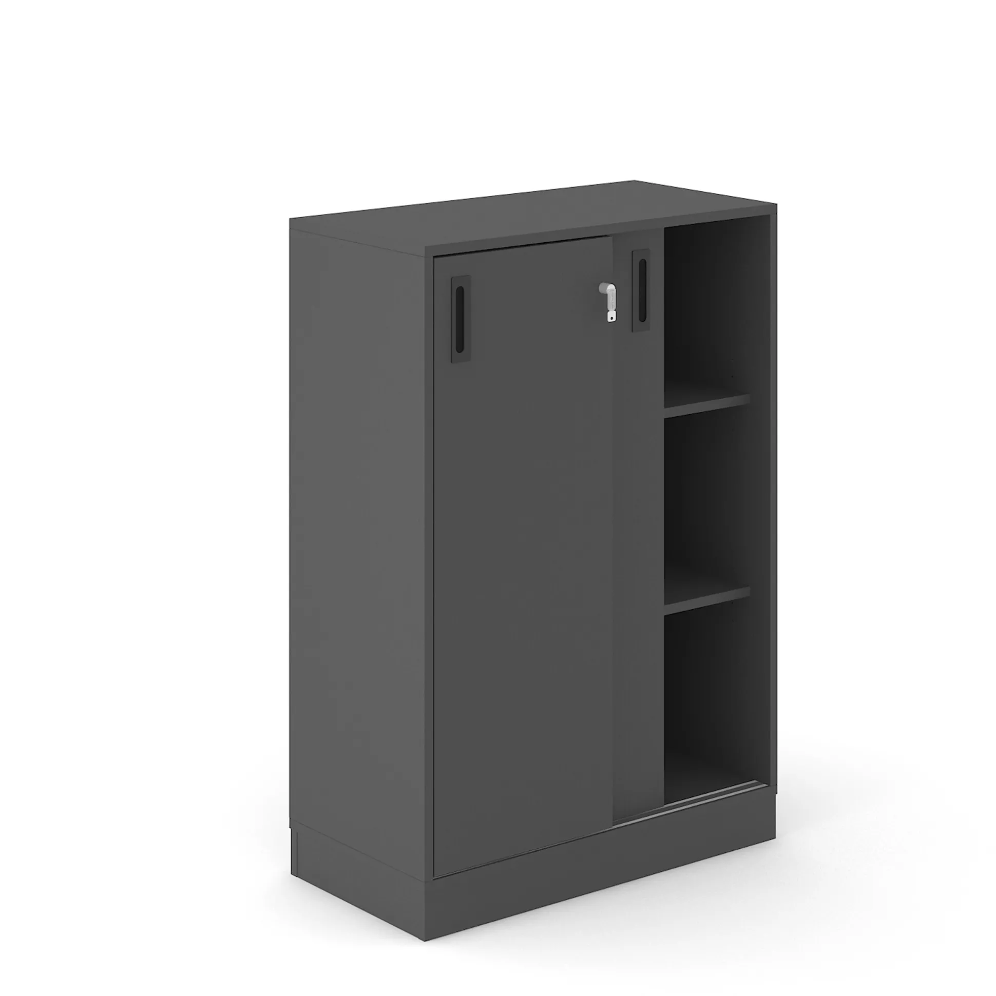 New Choice skydedørsskab med 6 rum og skydelåger med lås. Skabet er udført i slidstærk decor laminat, og fås i flere forskellige størrelser. Det er perfekt til opbevaring af diverse mapper og andet, og fungerer også som rumdeler imellem arbejdspladser. Skydedørsskabet fås i antracit, hvid eller eg.