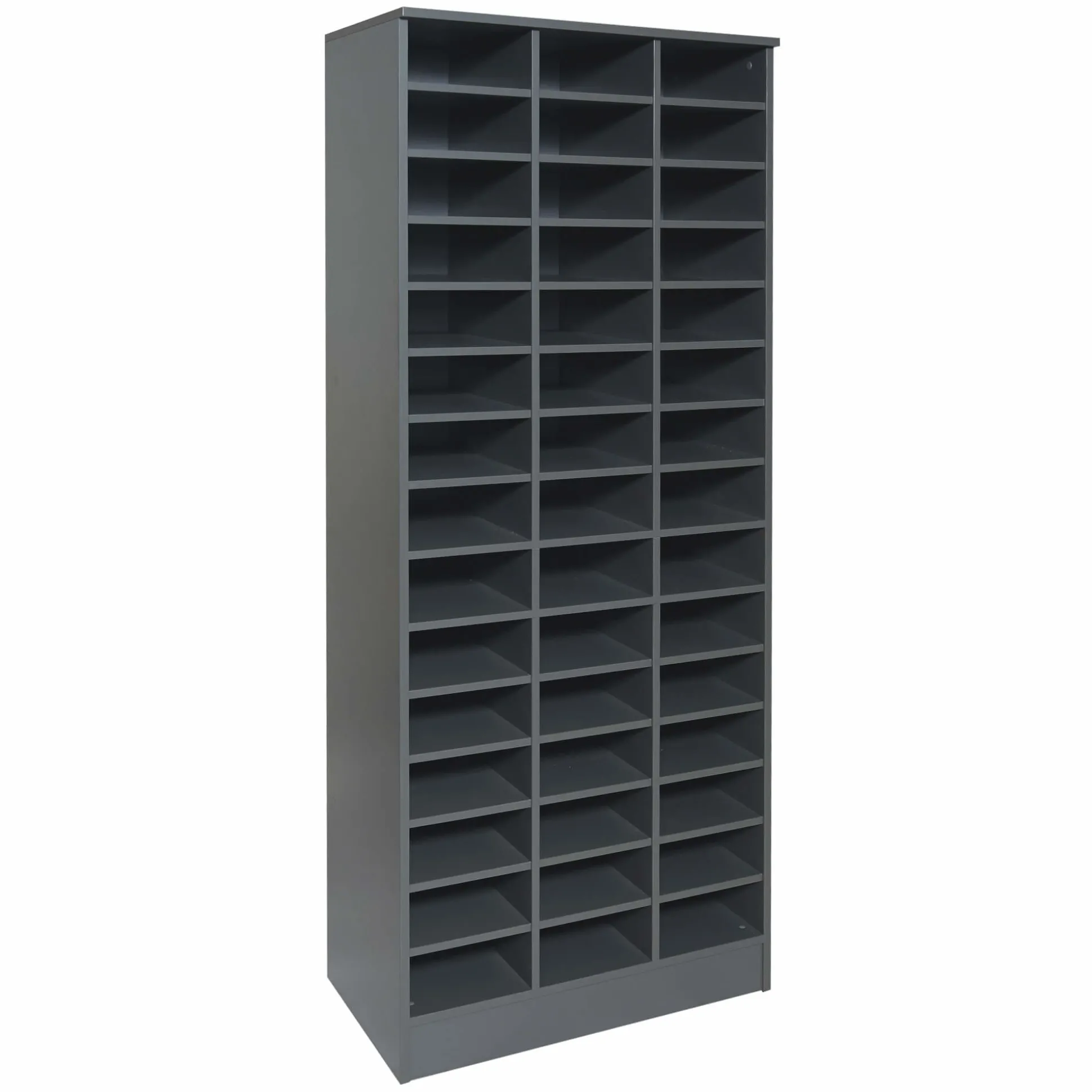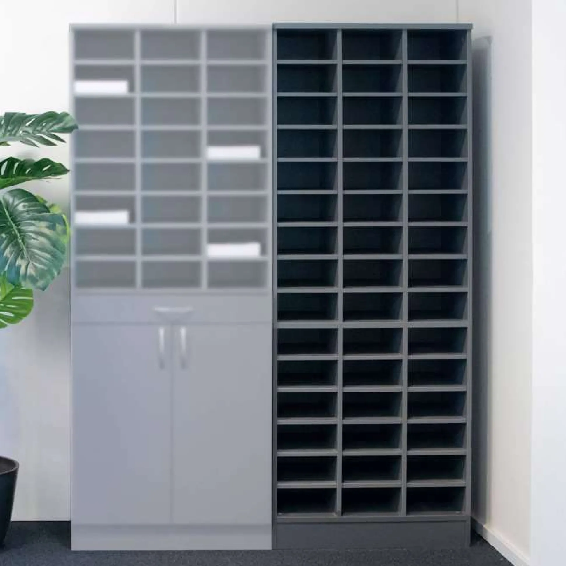 Robust og præsentabel postsorteringsreol med 45 rum. Udført i slidstærkt decor laminat og leveres samlede, lige klar til brug.