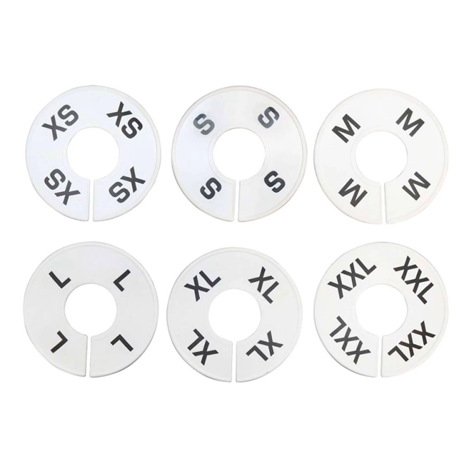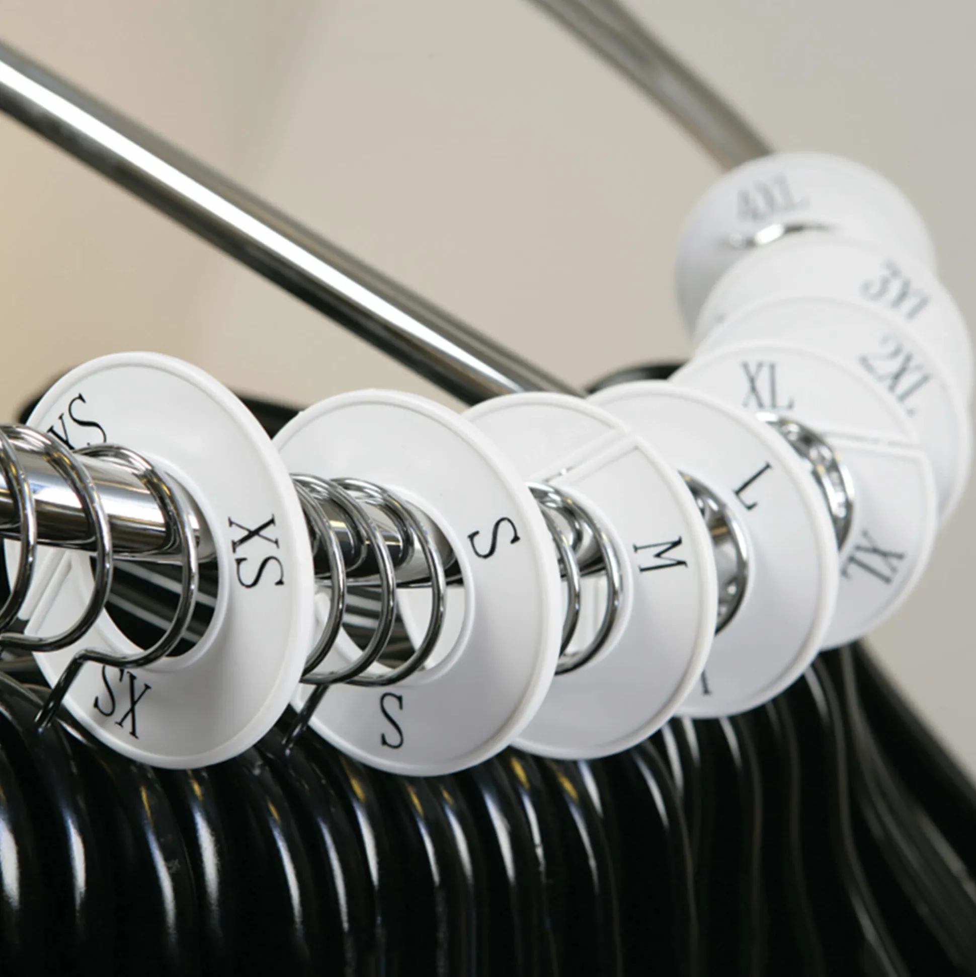 Hvis der ønskes synlig opdeling af størrelser samt et bedre overblik og nemhed for kunderne, så kan vi anbefale at benyttes størrelsesskiller/konfektionsnumre til tøjstativer. Denne sampak indeholder 25 stk. hvide størrelsesringe i Ø9 cm, med sort skrift. Sampakken er fordelt med 5 stk. af hver XS,S,M,L,XL.
