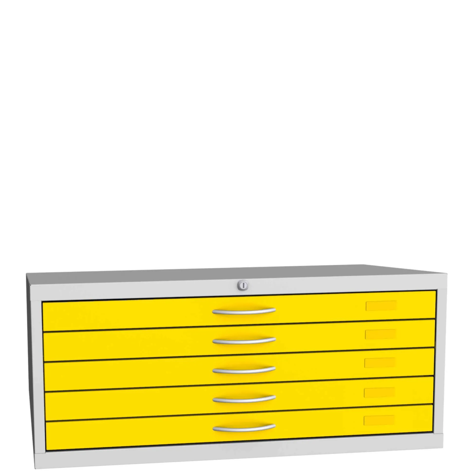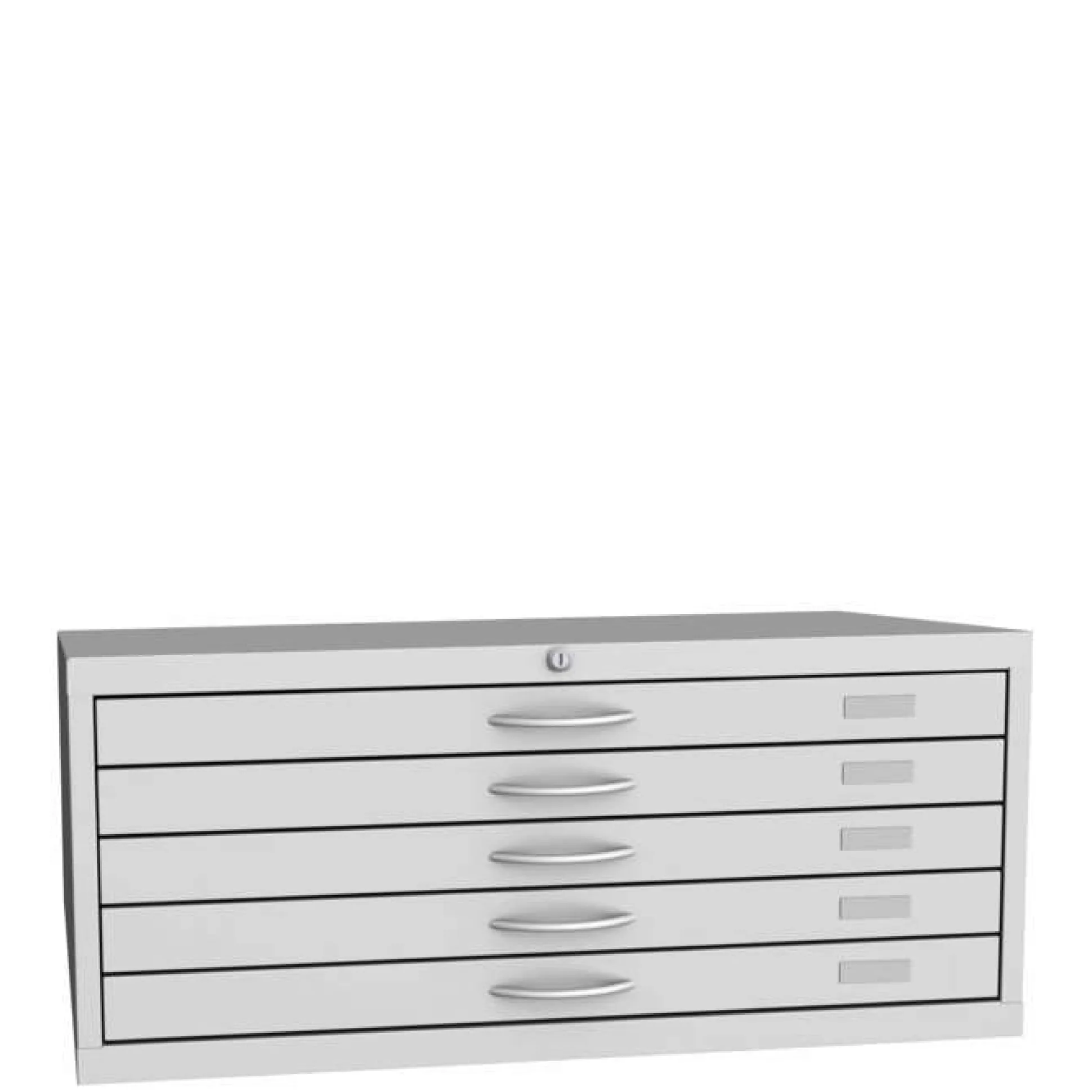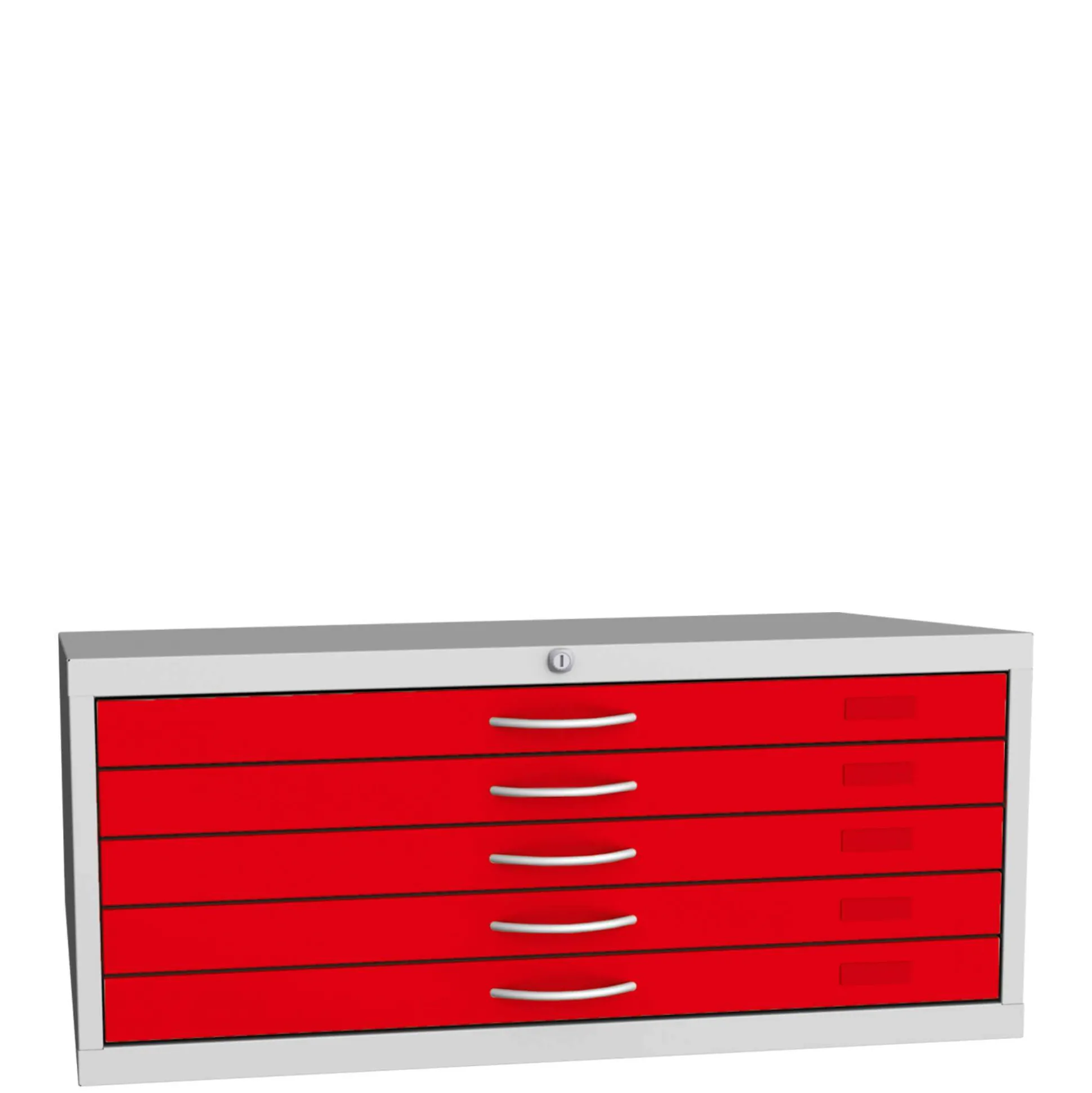 Tegningskab i grå med 5 skuffer, centrallås og etiketholder på front. Tegningskabet har bl.a. plads til dokumenter i A1 format.