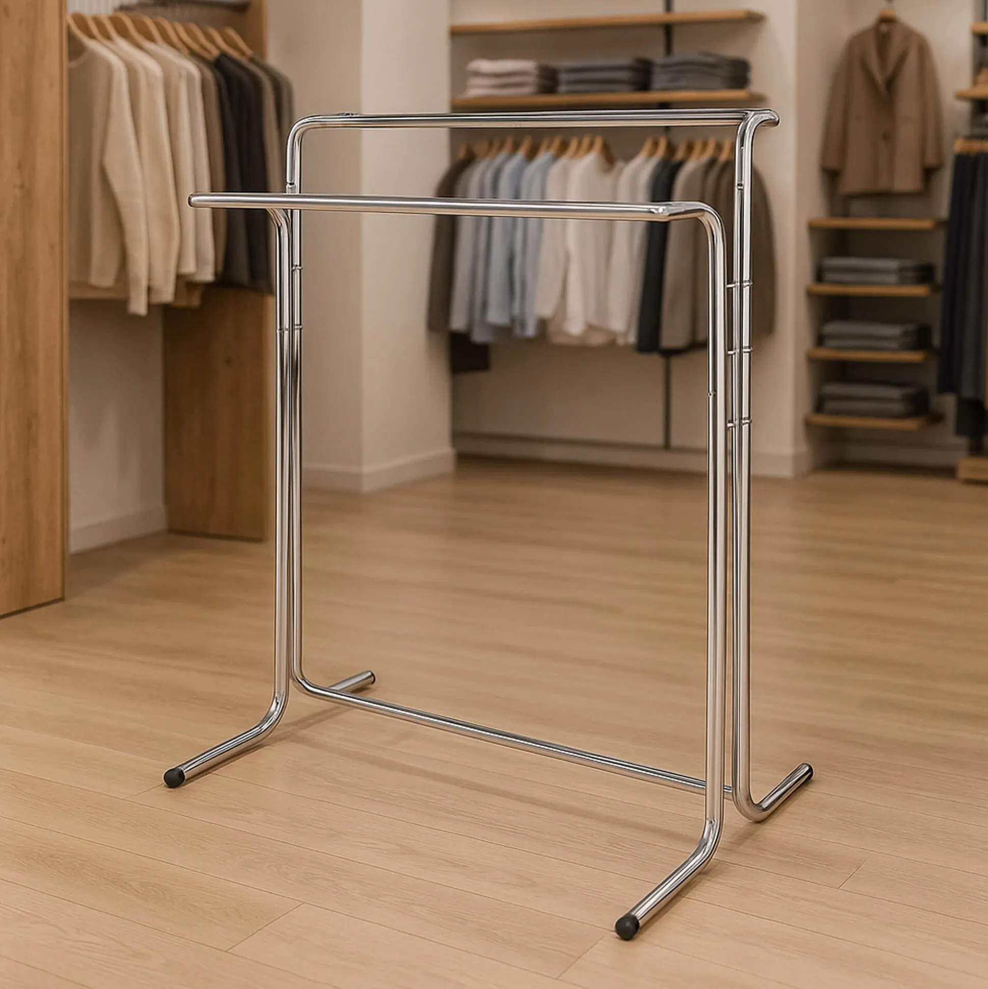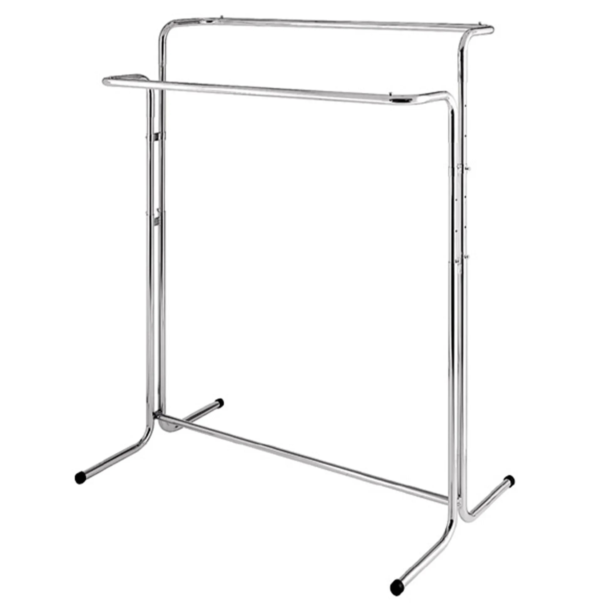 Stativ L140 i stål med blank finish, stativet har 2 bøjlestænger som kan justeres i højden individuelt af hinanden. Justerbar højde er 135-205 cm, med fast længde på 140 cm. Tøjstativet af fast stabil fod som måler 72 cm.
