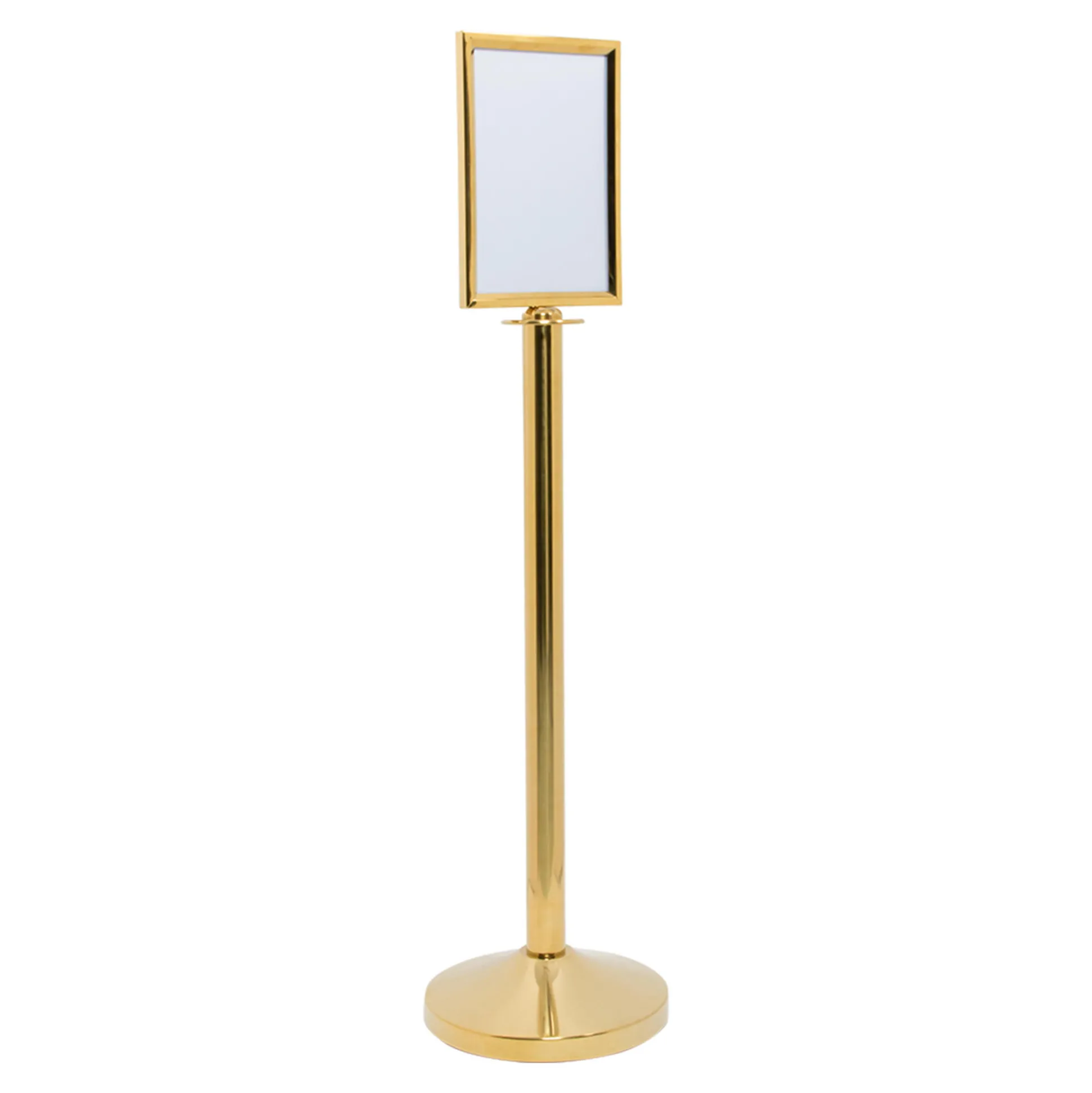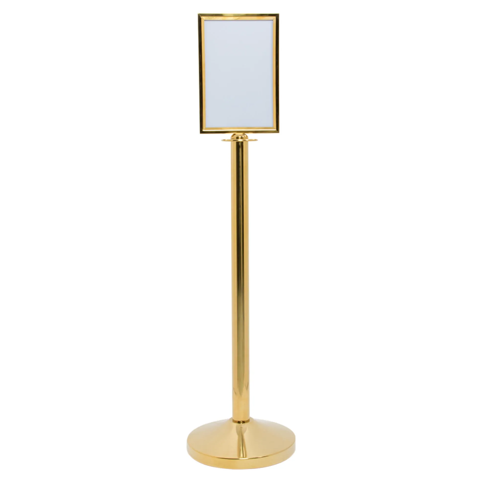 Brug dette A4 topskilt til at informere og vejlede dine kunder effektivt. Det er designet til at blive fastgjort på toppen af Securit® Classic afspærringsstolper, hvilket gør det nemt at udskifte og tilpasse indhold. Skiltet er lavet af poleret rustfrit stål med et guld finish, der giver en holdbar og vejrbestandig konstruktion.
