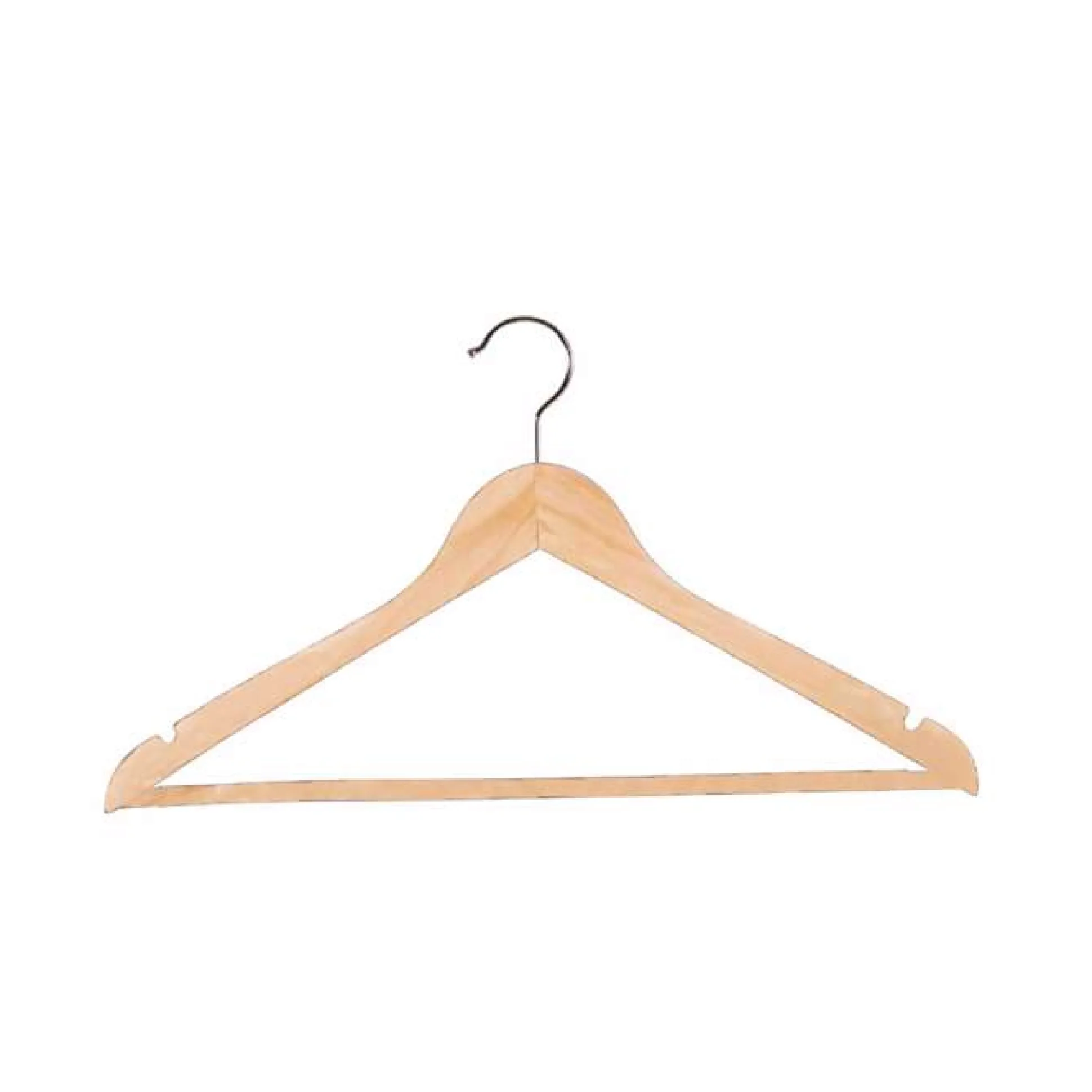 Bøjle i træ med metalkrog, hak og nonslip på skulderen, denne bøjler er en god allroundbøjle som både benyttes i butik, showroom men er også en populær bøjle som benyttes i garderoben.