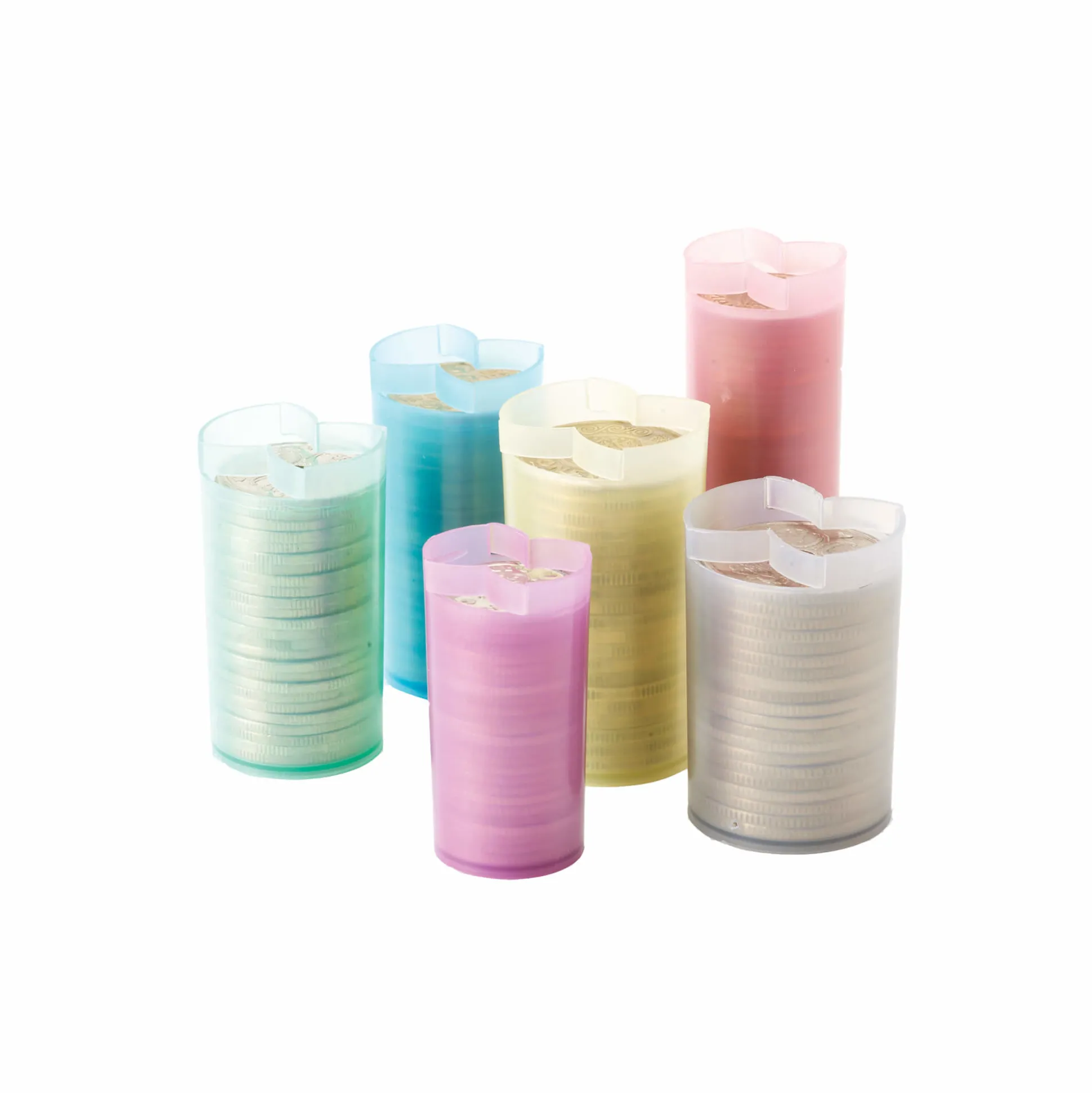 Assorterede tutter til opbevaring af diverse mønter i pakke med 300 stk. Mønttutterne er et stærkt genbrugsmateriale i gennemsigtig plastik. Nemme at fylde maskinielt eller i hånden. Farverne følger Nationalbankens specifikationer. Indhold: 80 stk. til 20 kr. – 80 stk. til 10 kr. – 55 stk. til 5 kr. – 50 stk. til 2 kr. 20 stk. til 1 kr. 15 stk. til 50 øre.