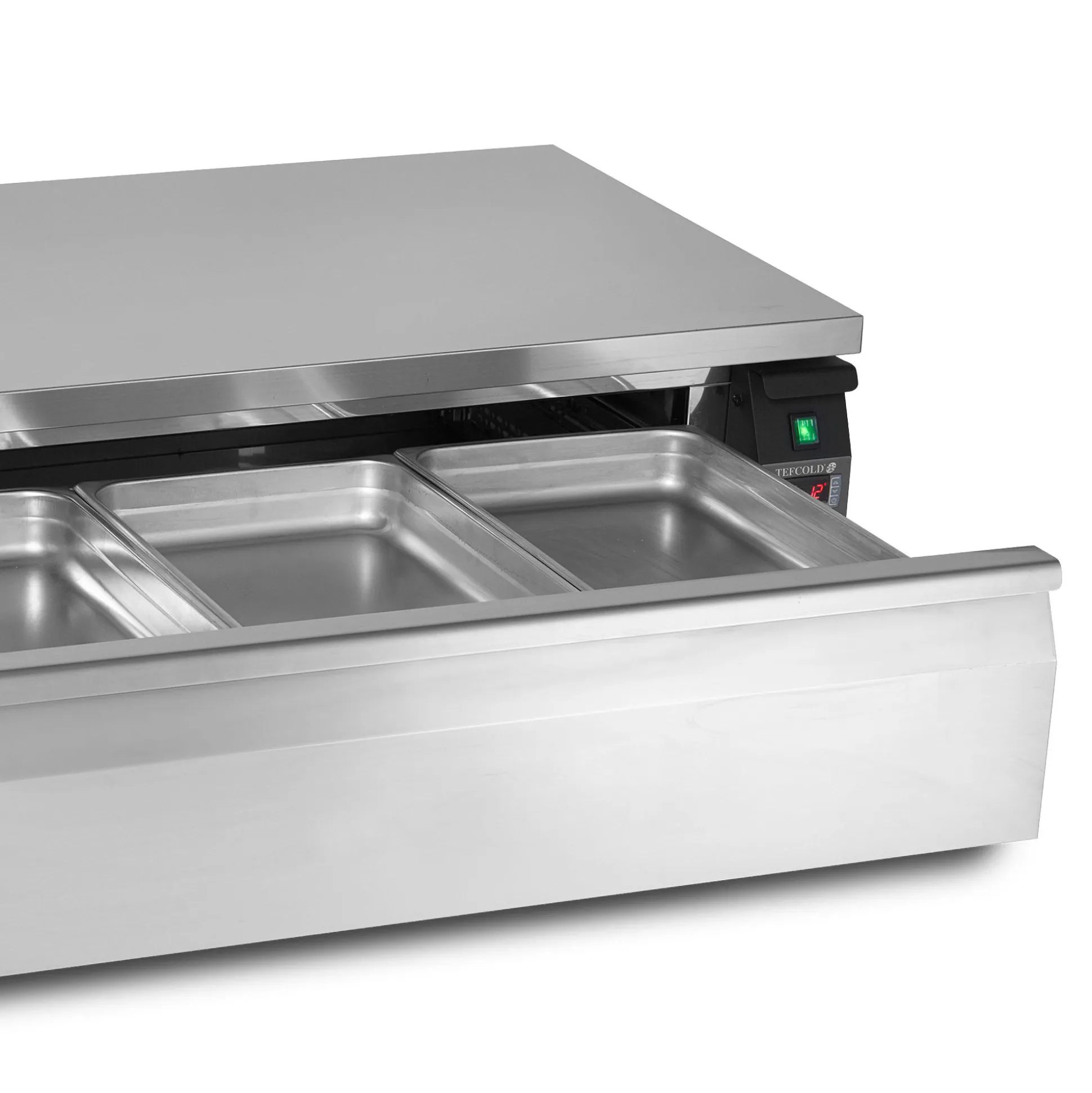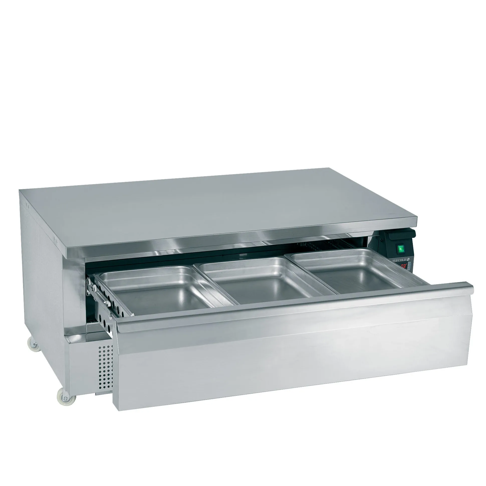 Med en nettovolumen på 77 liter og en kapacitet til 3 GN-kantiner, tilbyder UD1-3 maksimal lagerplads. Den robuste konstruktion i rustfrit stål (SS304) både indvendigt og udvendigt sikrer lang holdbarhed og nem rengøring. Skuffen kan bære op til 60 kg, mens bordpladen kan bære op til 240 kg, hvilket gør den yderst funktionel og holdbar. Enheden er udstyret med fire hjul, hvoraf to har bremser, for nem mobilitet og sikker placering.
