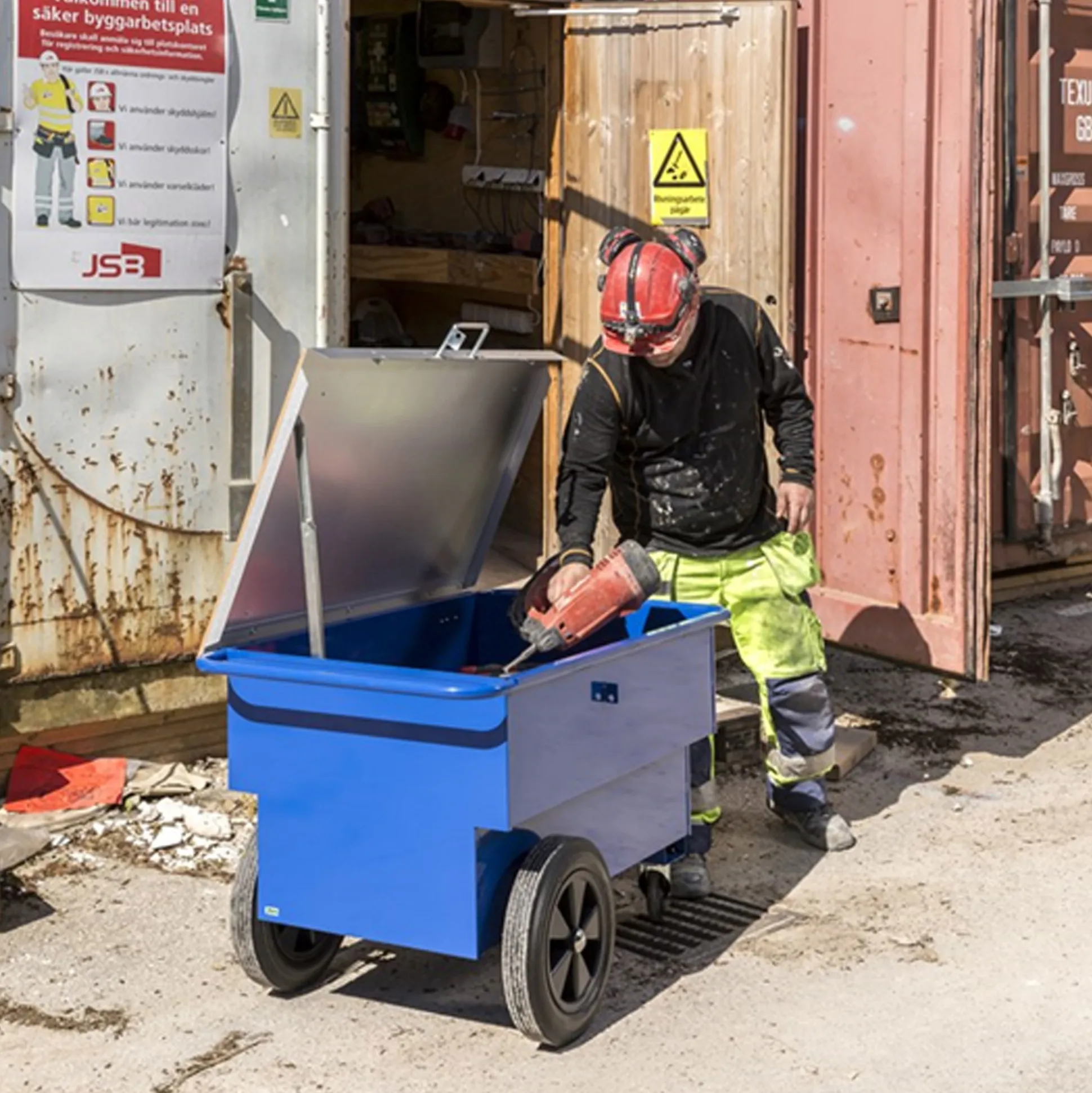 Værktøjsvogn, udført i 1,5 mm blålakeret stålplade. Låg i 2 mm aluzink plade belagt med 10 mm træplade. Stærk låsbolt, låses med en hængelås (ej inkluderet). Volumen: 300 liter.