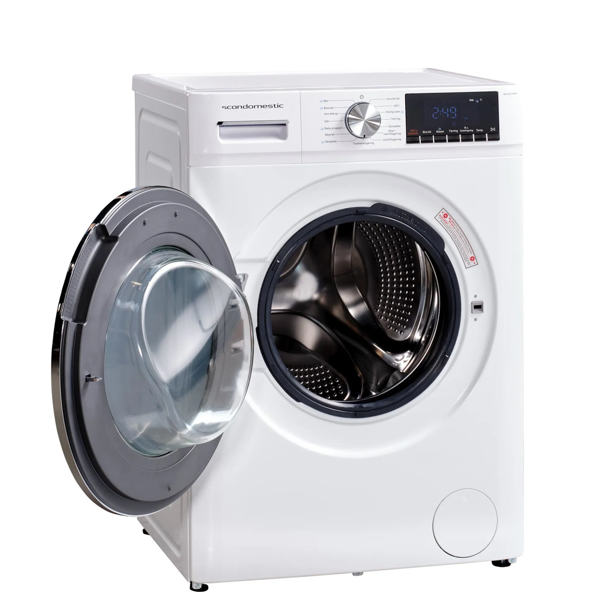 Stort LCD display med mulighed for udskudt start funktion 0-24h, hermed opnås maximal fleksibilitet så maskinen kan programmeres til at starte når det ønskes. Derudover er der resttidsvisning, så du kan følge programmets resttid. Du kan også se programmets indstillinger og ydermere er det muligt at låse programmet, så børn ikke kan ændre indstillingerne