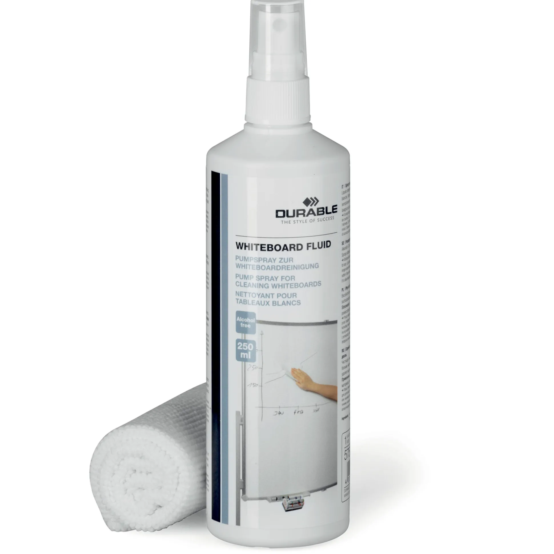 Rensesæt med rensespray og microfiberklud til rengøring af whiteboardtavler. Uden alkohol. Spray lidt væske på kluden, rens og tør tavlen. Fjerner snavs, fedtfingre og blækrester. Renser og beskytter whiteboardtavlens overflade varigt. Indhold: 250 ml spray og en mikrofiber klud (25x25mm).