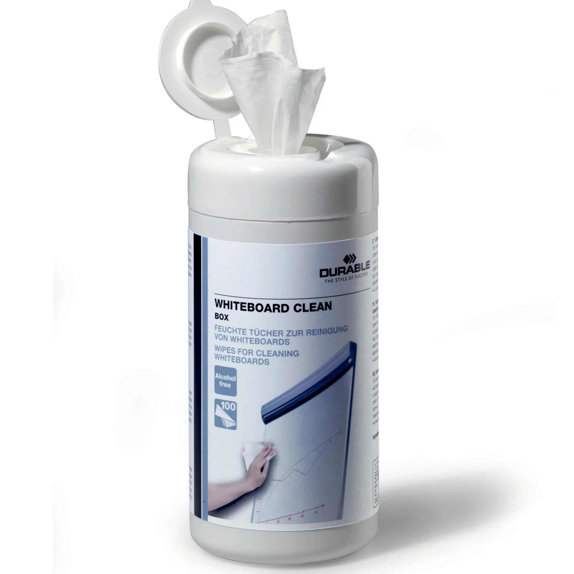 Beholder indeholdende 100 fugtige renseservietter. Til rengøring af whiteboardtavler. Er uden alkohol og er bionedbrydelig.