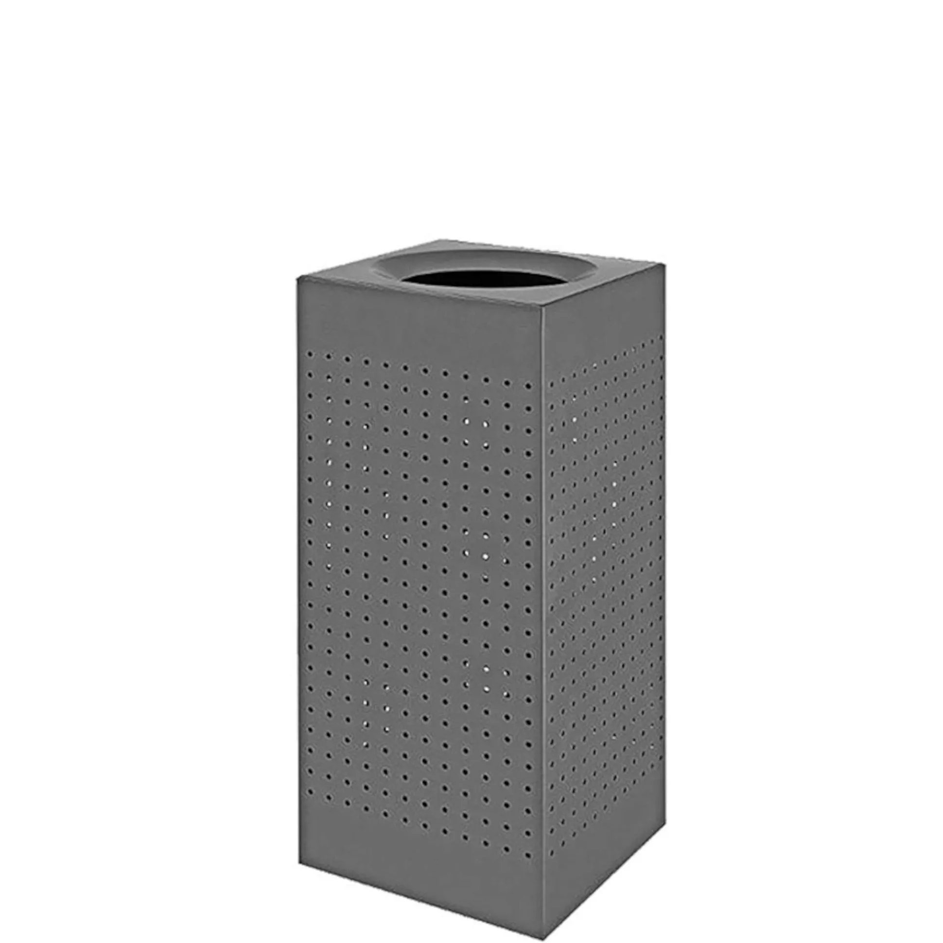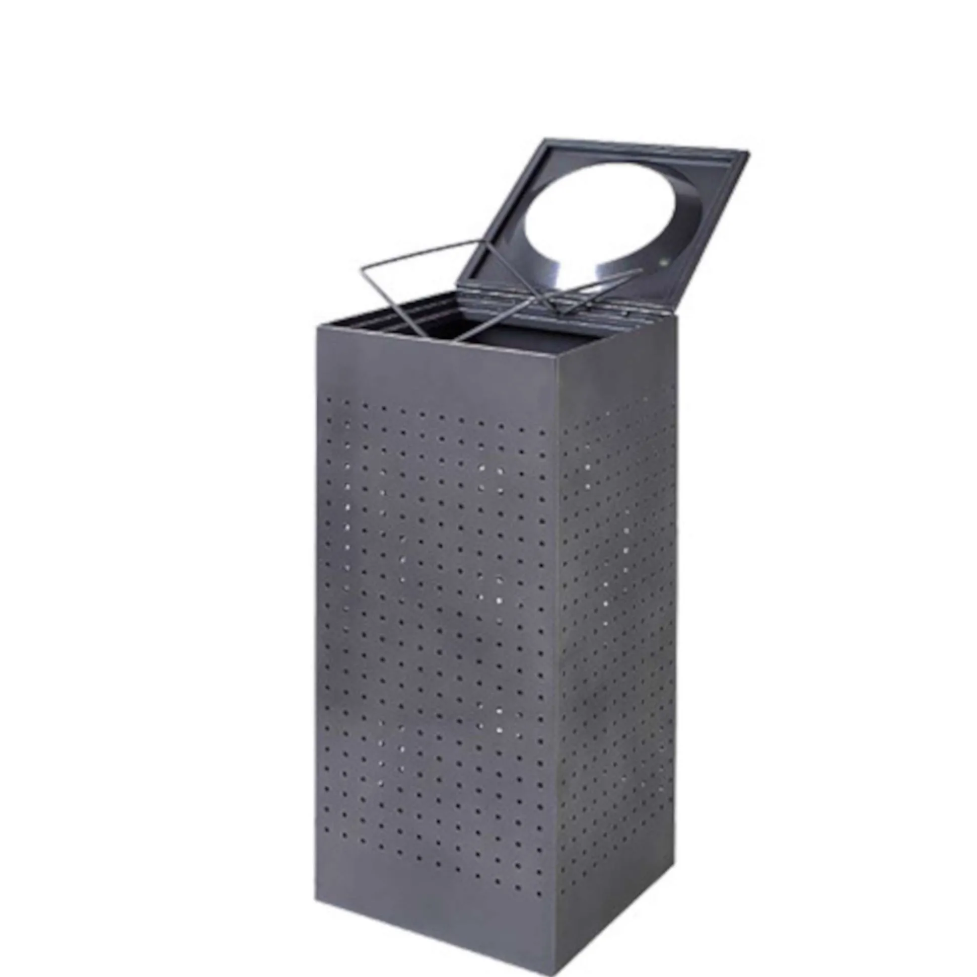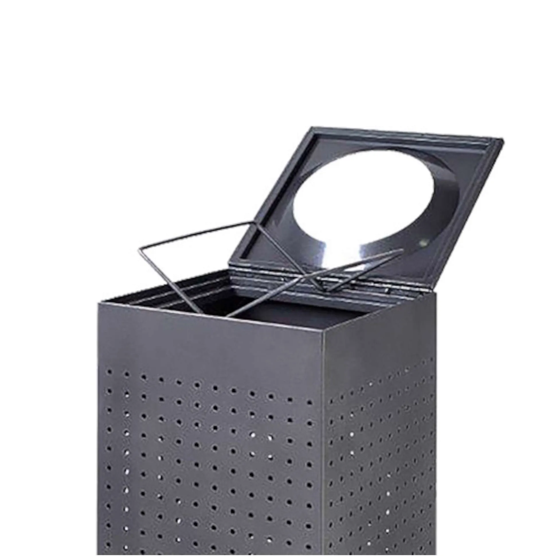 Affaldsbeholder med rundt hul i toppen. Udført i kraftig grå (RAL9007) pulverlakeret stålhulplade. Passer til affaldssække på 120 liter. Let fastgørelse og tømning af sæk. Hængslet låg og integrerede poseholdere.