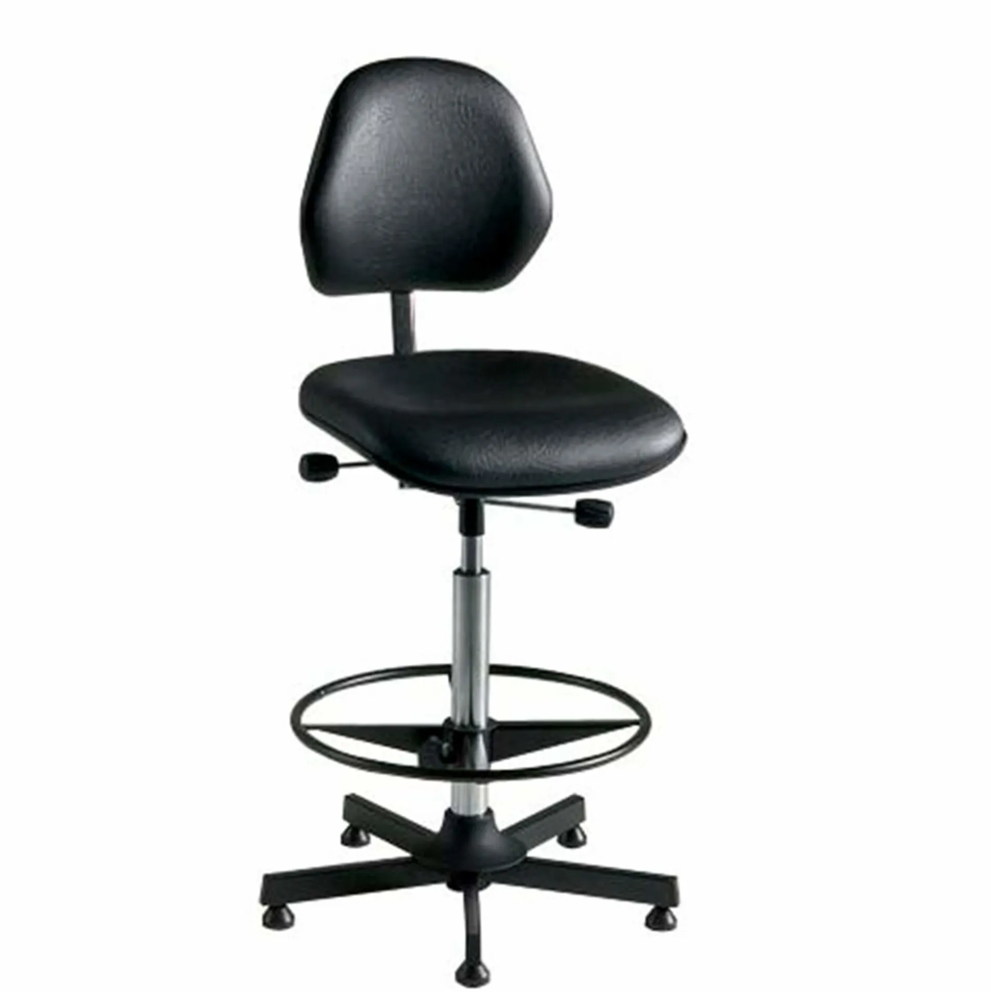Arbejdsstol med kraftig kunstlæder. Trinløs indstilling af sæde og ryglænsvinkel foregår hurtigt og enkelt ved hjælp af to små gaspatroner, mens du sidder på stolen. Leveres med glidesko. Hjul kan tilkøbes.