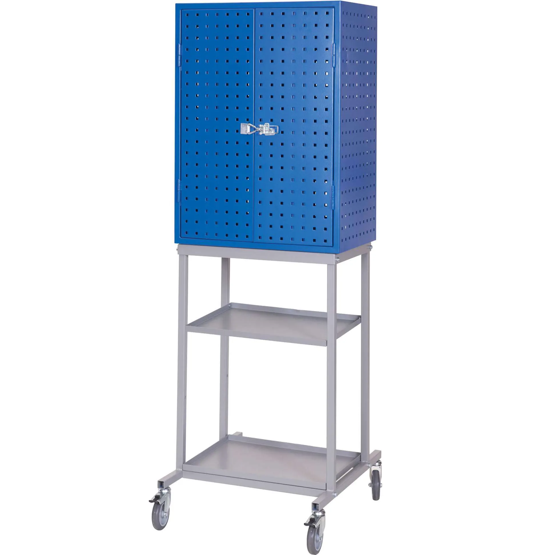 Mobil værkstedsvogn med aflåselig værktøjsskab, hvor der er mulighed for ophæng på 3 sider samt låger. Vægt 56 kg. Blå. Skab kan låses med hængelås (ej inkl.)