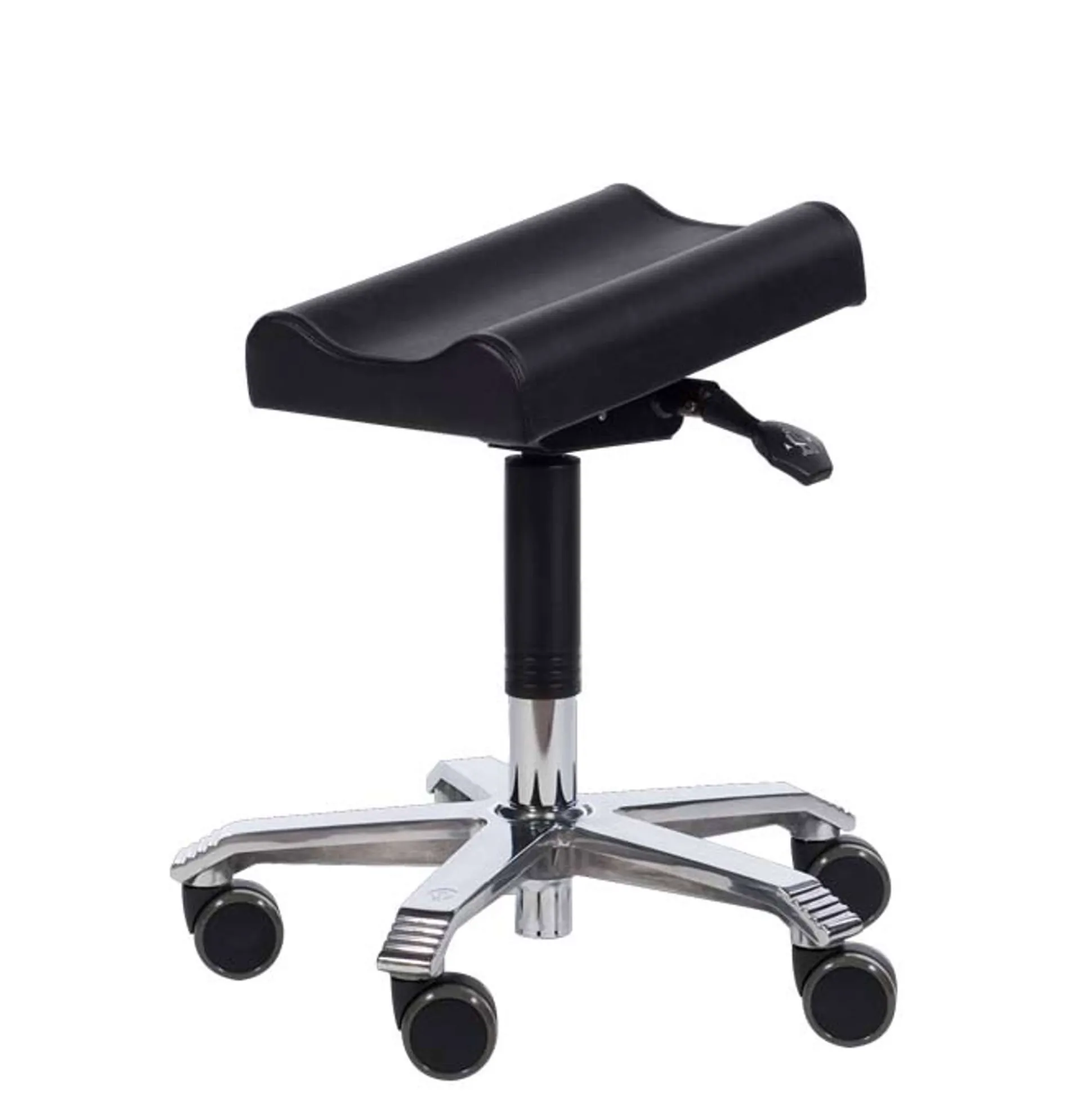 Benstøtte til ét ben. Støtter hele benet. Vinklen kan justeres 0-12⁰. Højden kan justeres fra 42,5 til 57,5 cm. Monteret med bløde hjul. Fodkryds i aluminium. Udført i kunstlæder. Pudens mål: 25×40 cm.