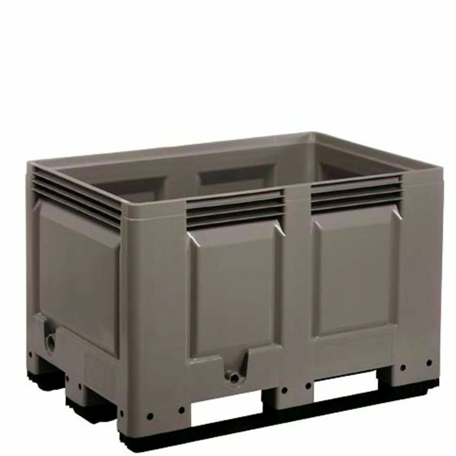 Pallebeholdere i HD-polyetylen. Mål: 120 x 80 x 79 cm. 535 liter. Med 3 meder. Big Box har dobbeltvæggede profiler i alle hjørner, hvilke sikrer en høj last- og stablingskapacitet. Maxbelastning på 500 kg og 4500 kg ved stabling.