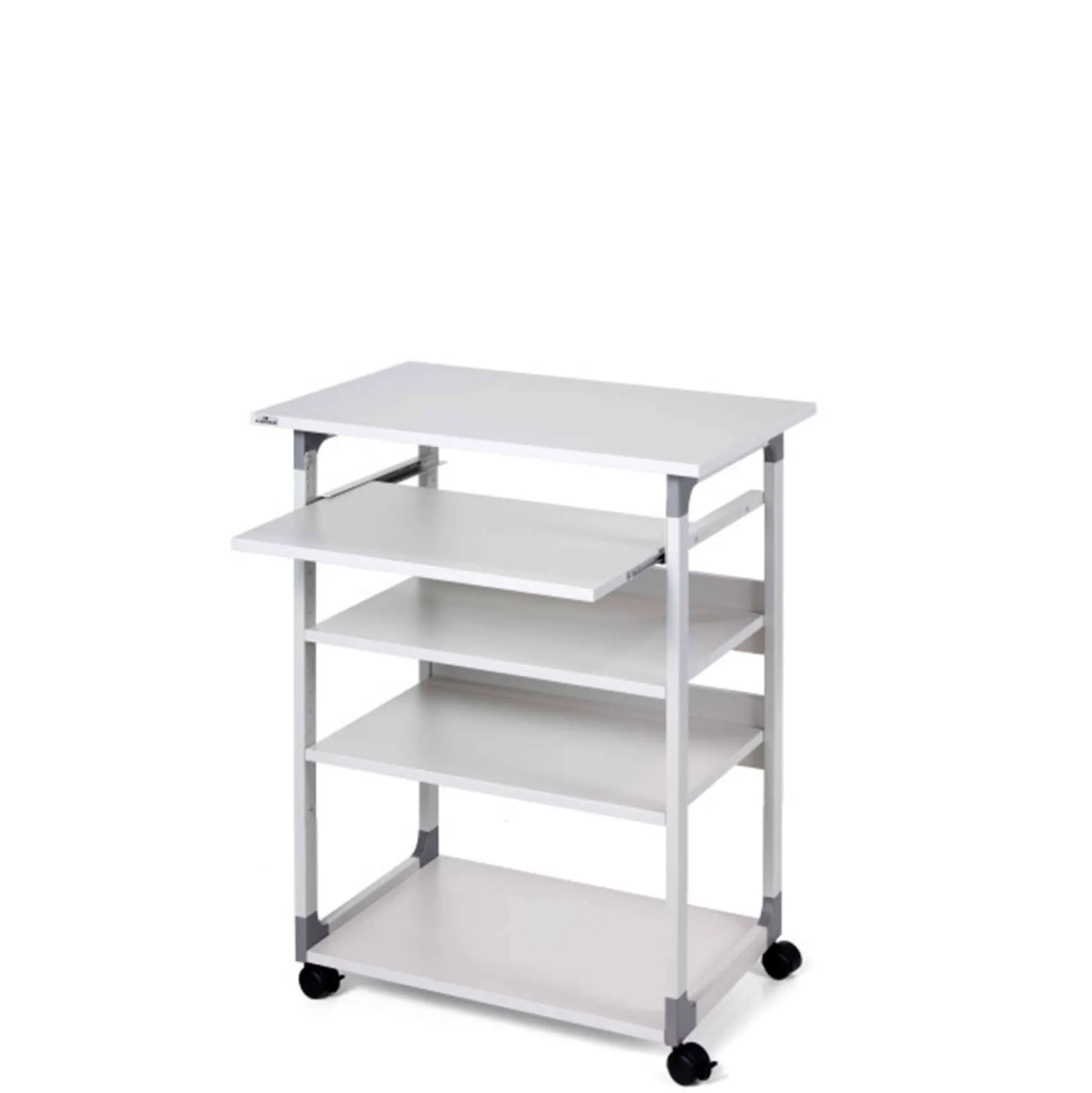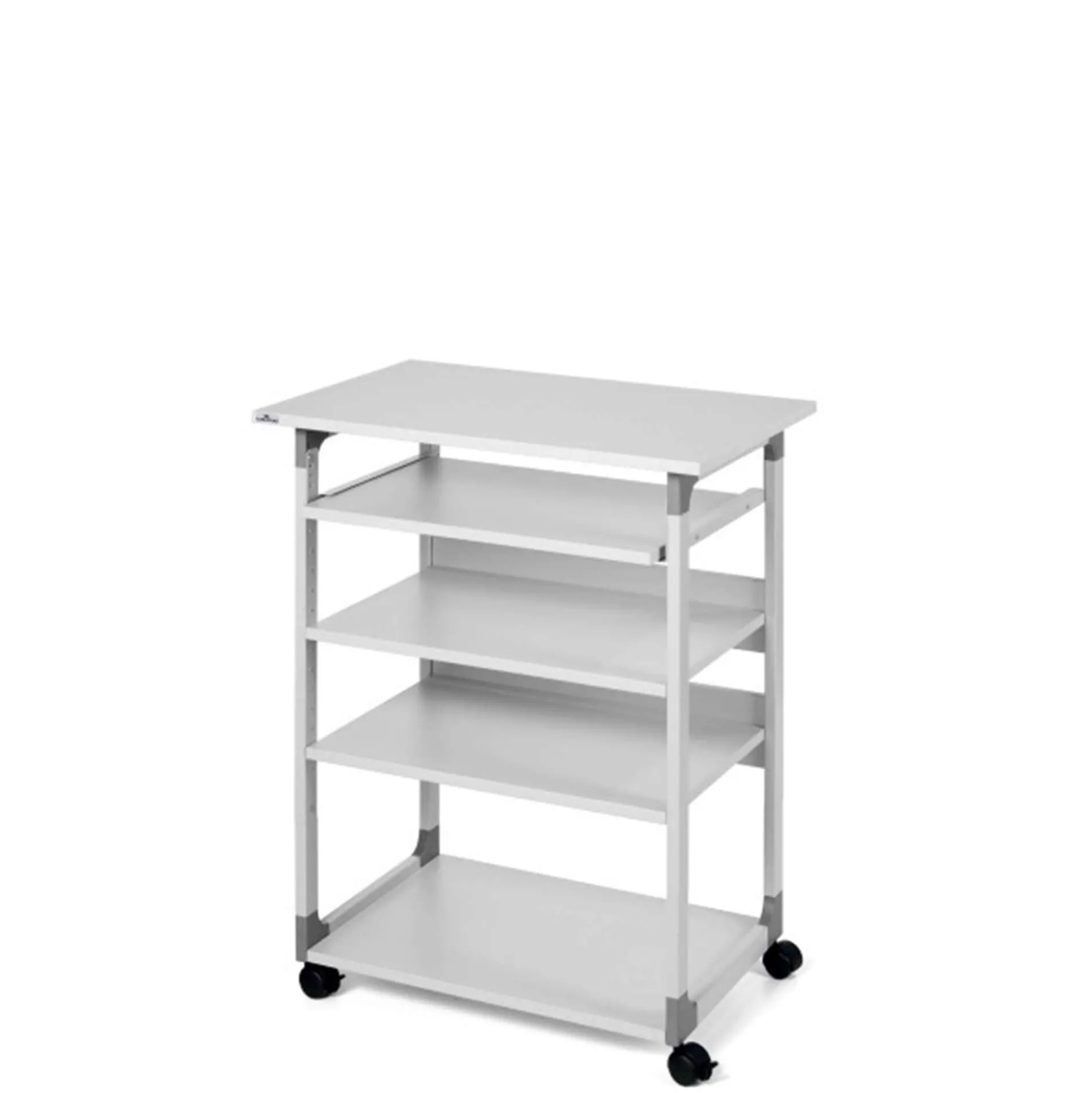 Mobilt computerbord med skærm og udtrækkelig tastaturhylde. Bordet kan højdejusteres fra 95-115 cm. Har to mellemliggende hylder, som kan højdejustes i trin på 3 cm.