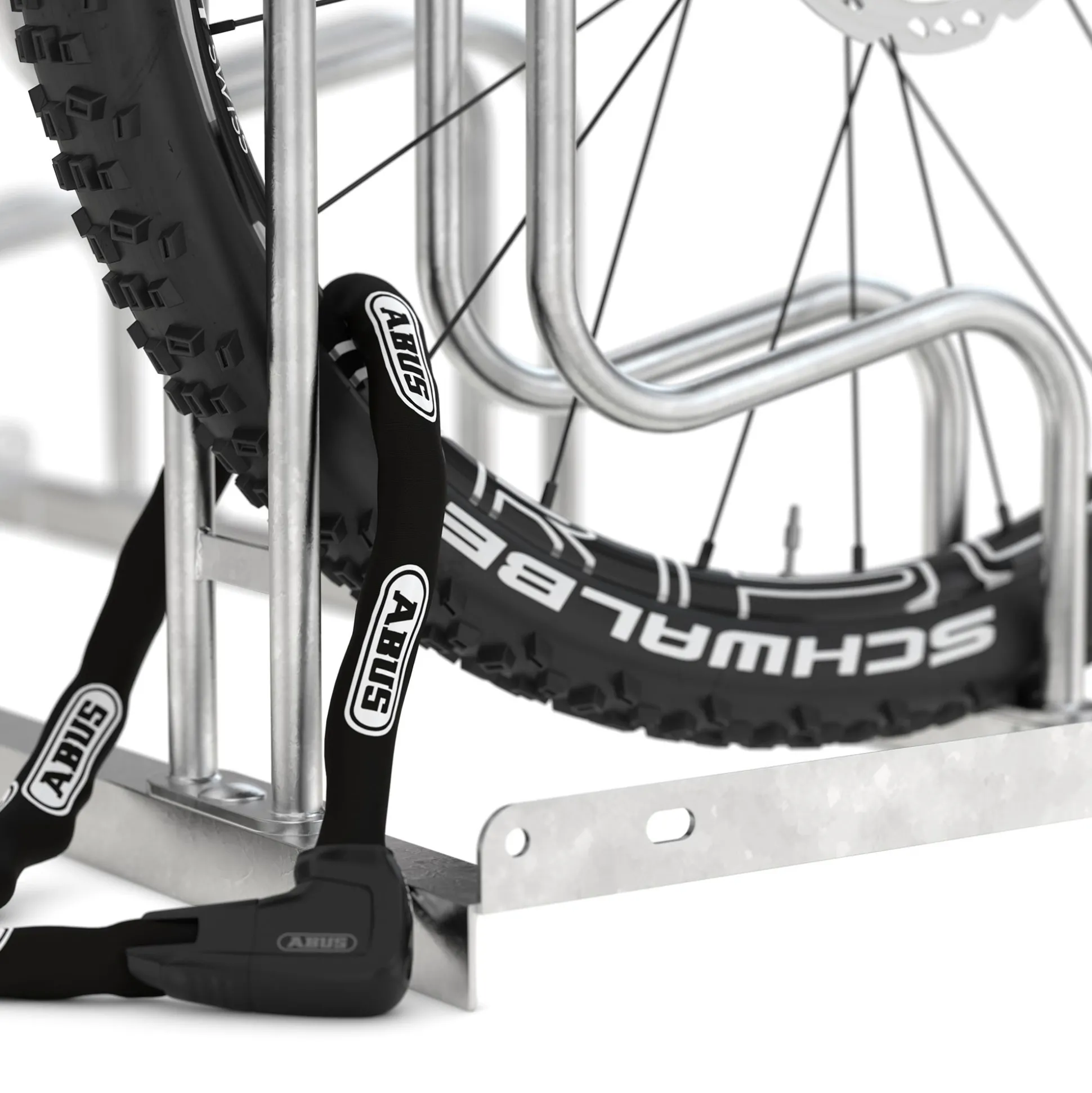 Moderne cykelstativ med 12 høje bøjler for ekstra stabilitet, der bl.a. velegner sig til mountainbikes. Cykler med op til 55 mm dækbrede kan parkere her komfortabelt, understøttet af de ekstra høje bøjler, hvor cykellåse også kan fastgøres. Værdifuld plads spares ved at parkere med forskudt højde eller ved at give adgang fra begge sider efter behov.