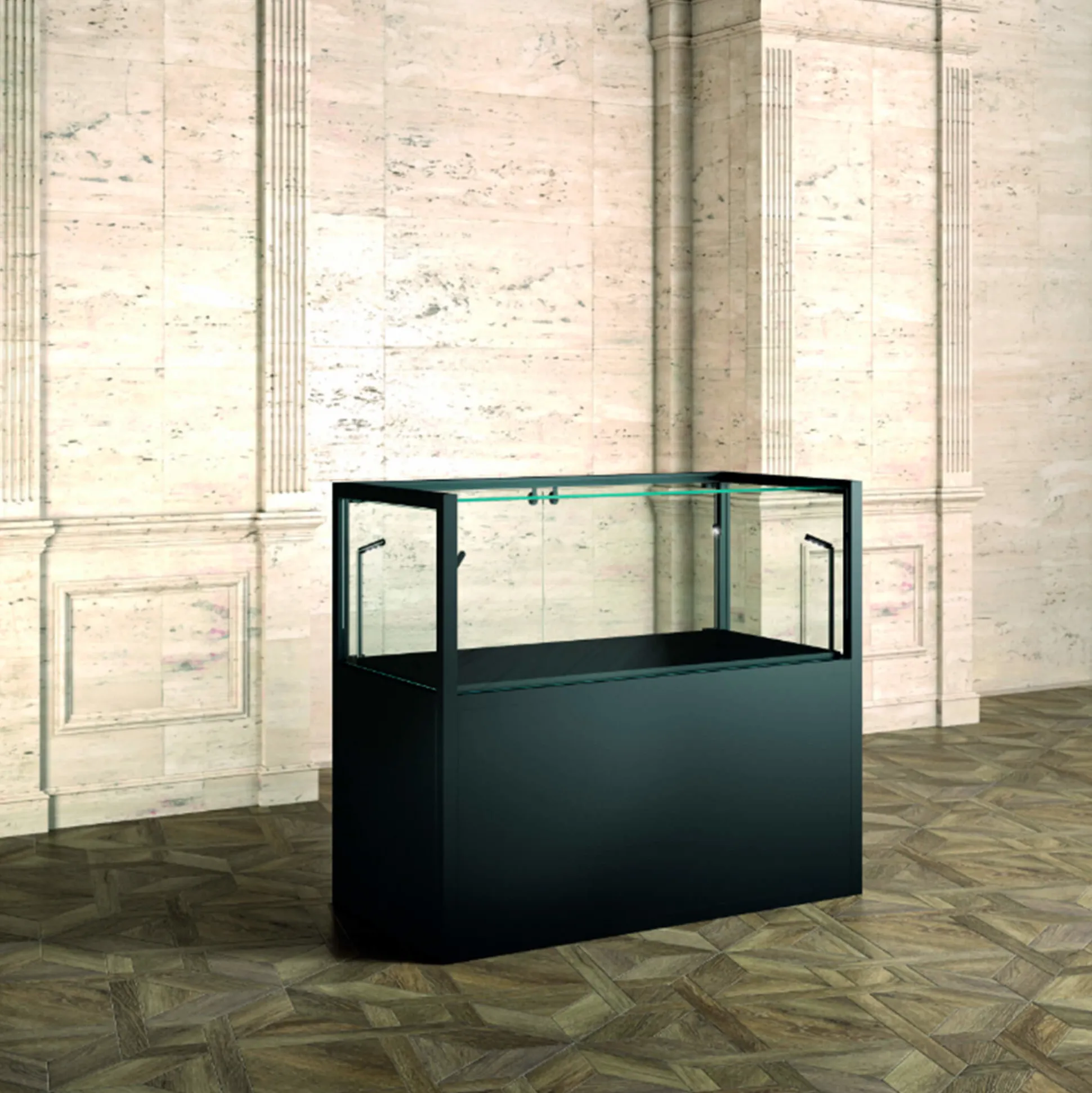 Eksklusiv og elegante glasmontre/glasvitriner Arta i matsort lakeret jern med anti-fingeraftryk finish.