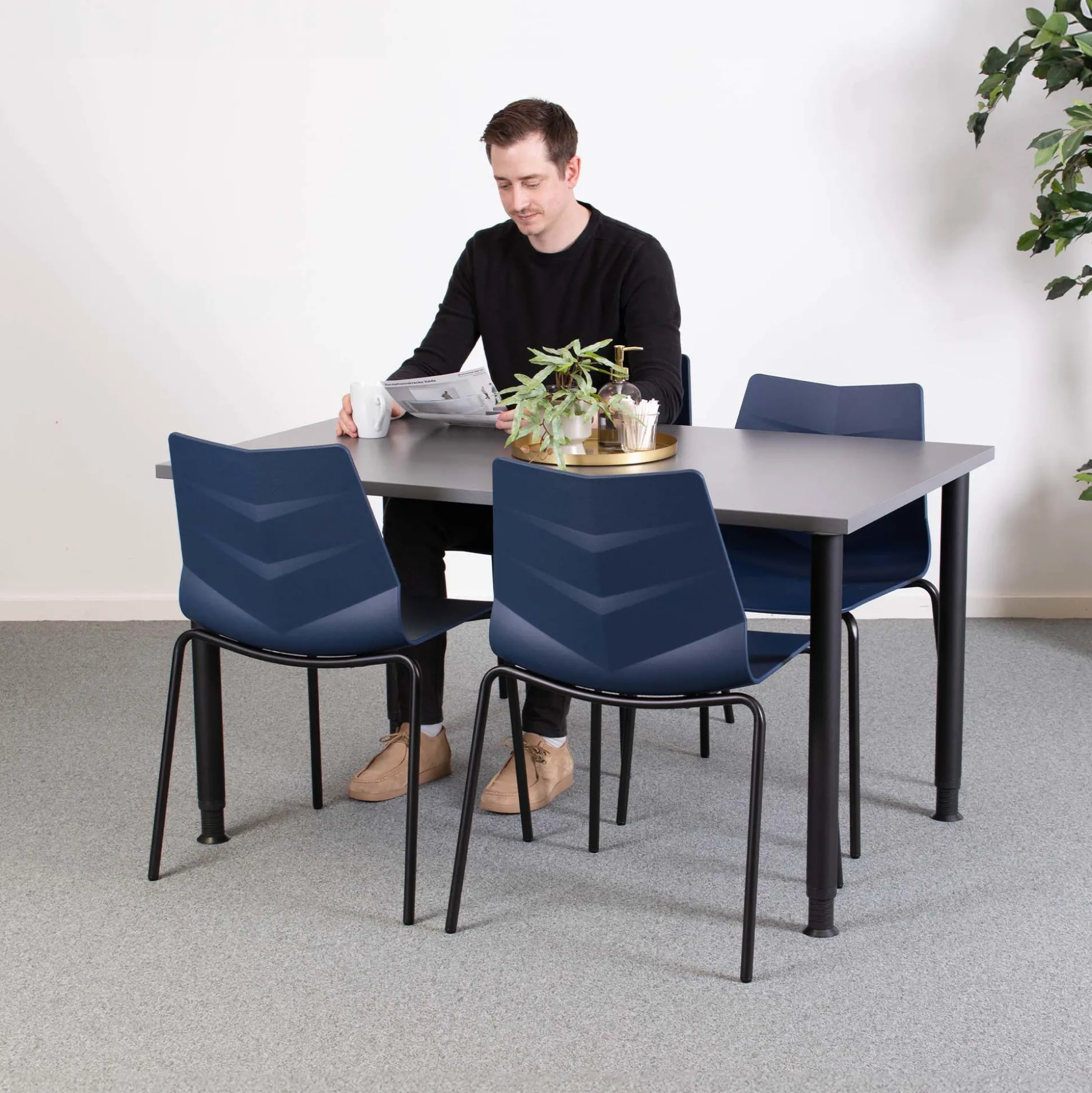 Titus Stabelstolen er en praktisk stabelstol med fine detaljer, og et let elegant design. Stolen består af en helstøbt skal i fleksibel plast. Og stellet er fremstillet i kraftigt, sort pulverlakeret stål.