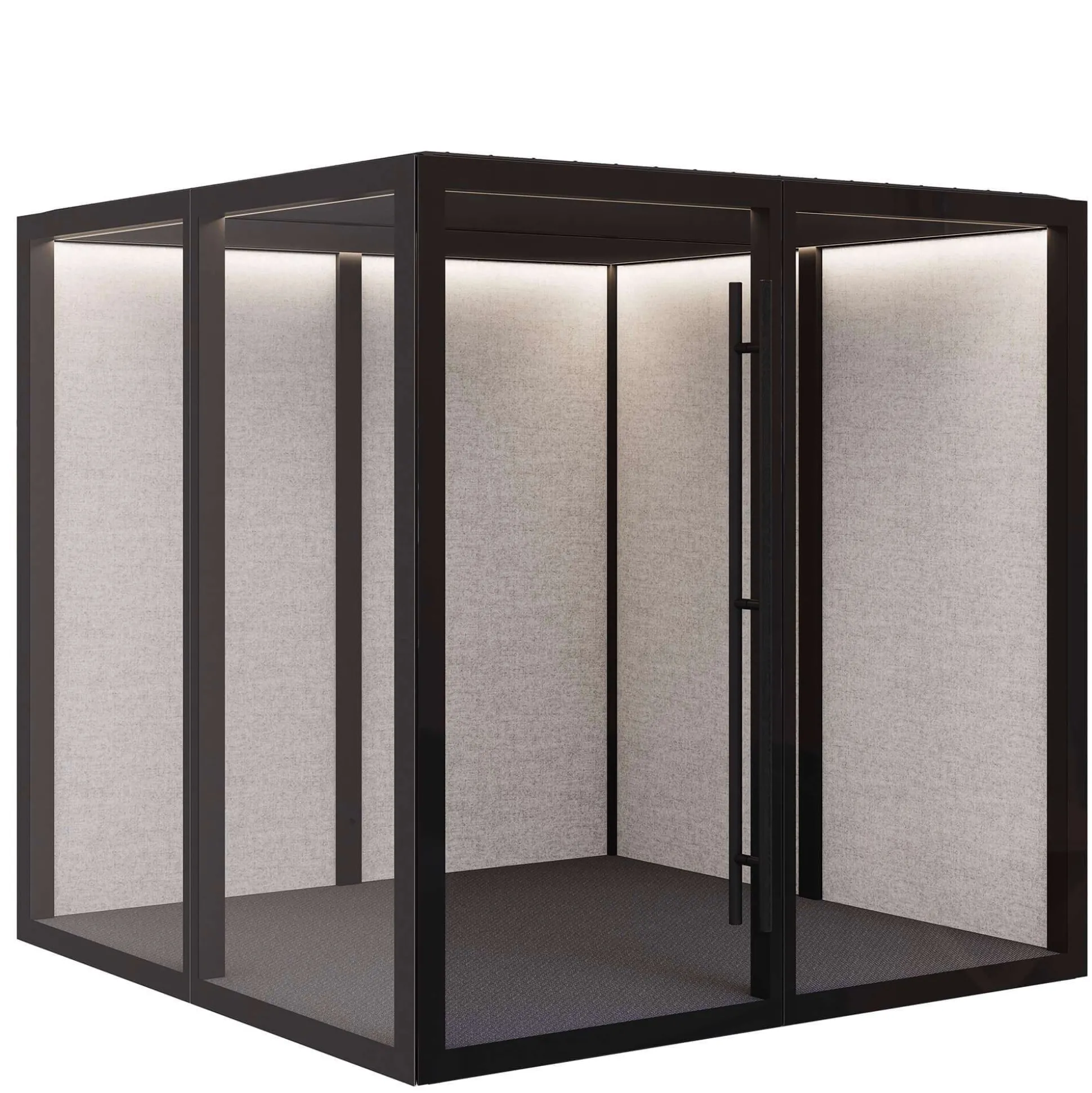 | Vægge | 2 sider med glas/2 sider med lydabsorberende materiale |