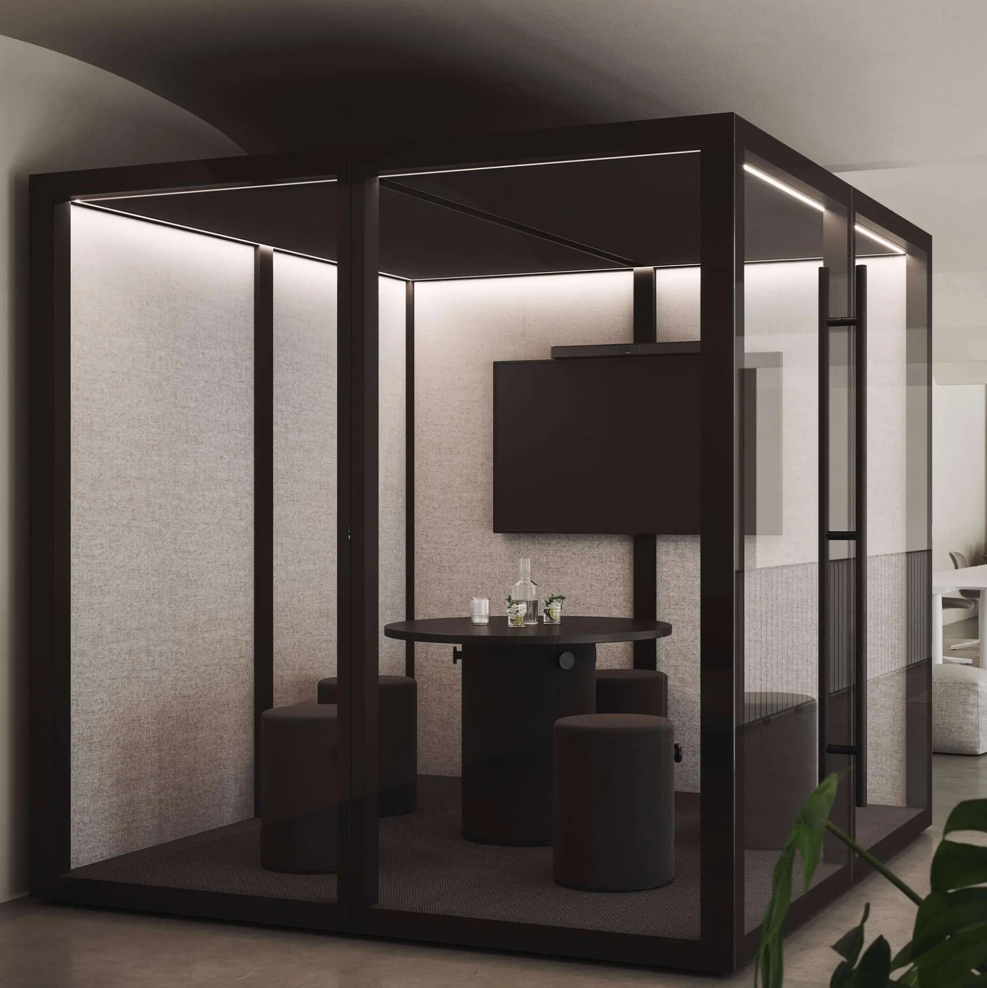 Zen Pod er mere end blot et stillerum, det er et sted man kan trække sig tilbage og fokusere uforstyrret på sine opgaver. Møderummet er elegant og designet ud fra et funktionelt synspunkt i materialer som træ, uld, glas, aluminium og stål.