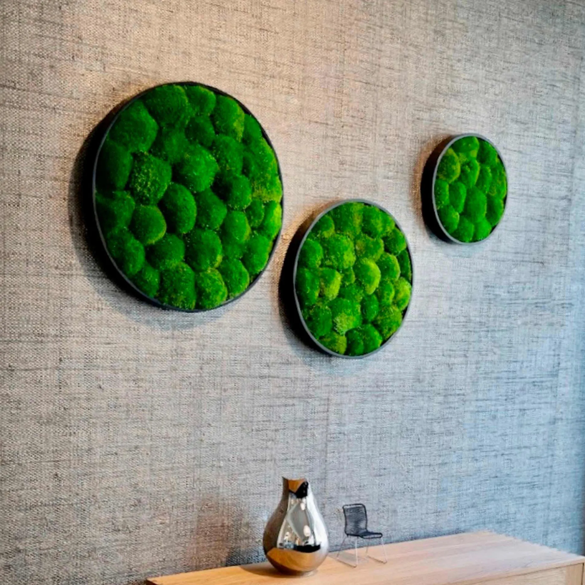 Smukt mosbillede fremstillet i eksklusivt pudemos. Det naturlige materiale skaber en organisk og beroligende skovbundseffekt, og har imponerende støjabsorberende egenskaber, der bidrager til forbedret akustik i rummet.