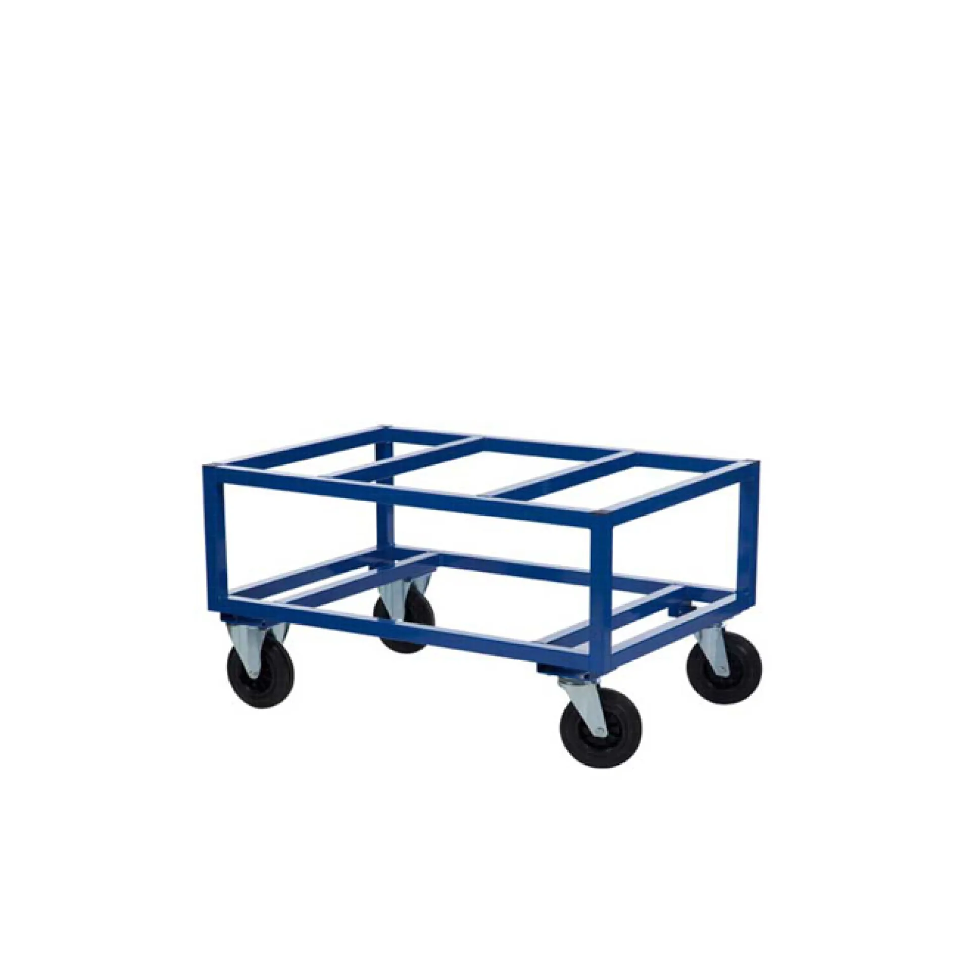 Denne pallevogn er svejst og passer til EUR-paller. Den har 2 faste og 2 drejelige hjul i massivgummi. Lasteevne: 800 kg. Egenvægt: 36 kg. Mål: 1200 x 800 x 650h mm.