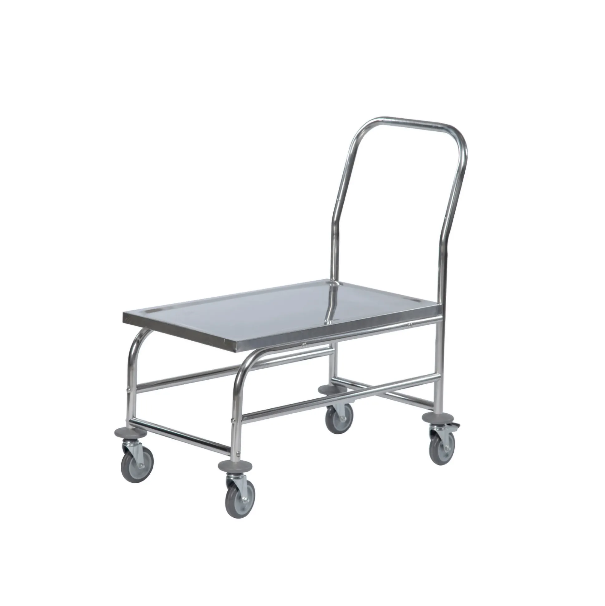 Rustfrit plateauvogn. Mål: 50x88x94h cm. Med 4 svingbare hjul, hvoraf de 2 er låsbare, Ø10 cm. Højde til platform: 47 cm. Belastning: 150 kg. Leveres usamlet.