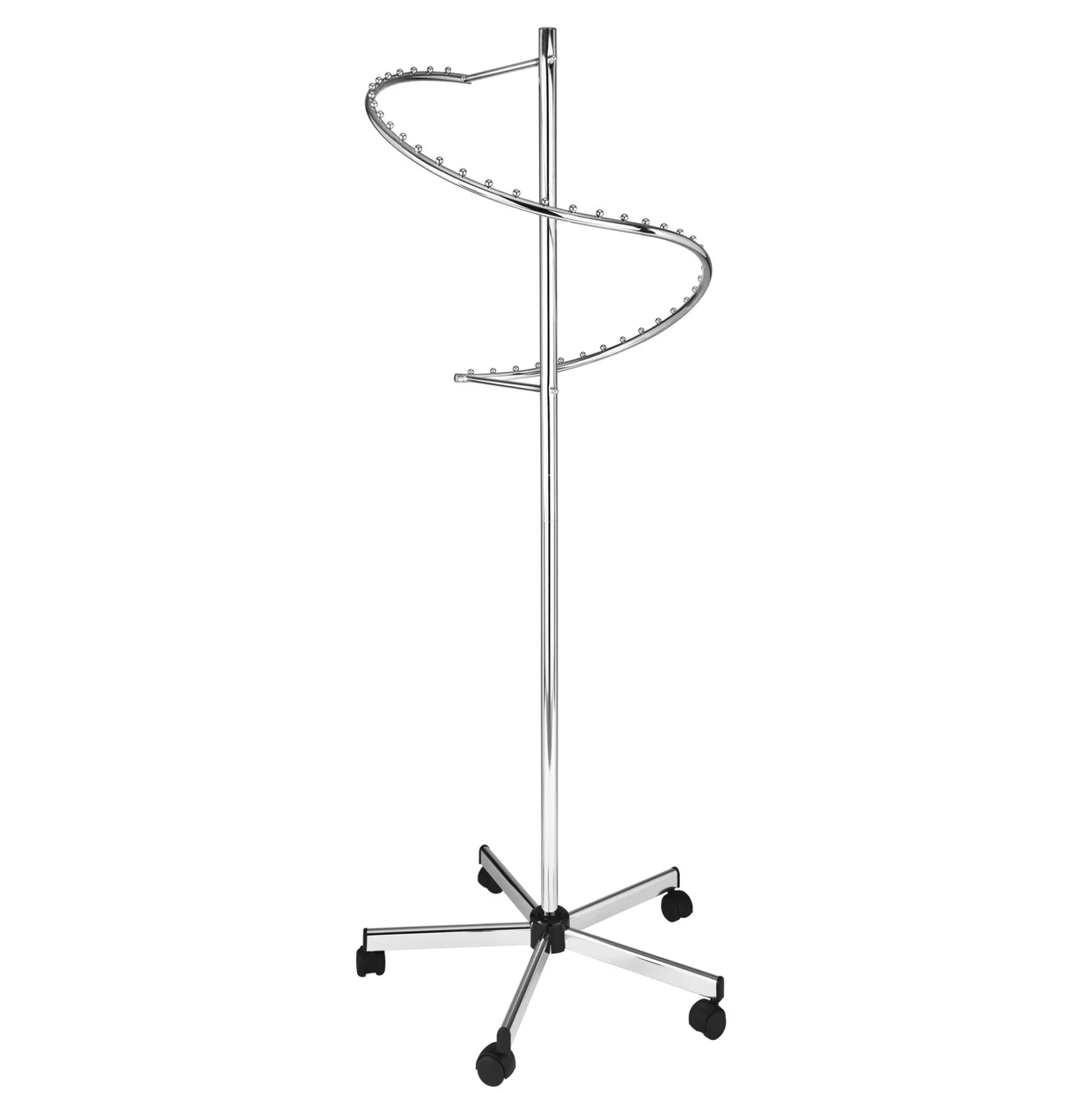 Rundt tøjstativ med faldende bøjleophæng i blank finish. Der er kugler ned langs bøjlestang til bøjler. Tøjstativet har en stabil 5-grenet fod Ø72 cm med sorte nylonhjul.