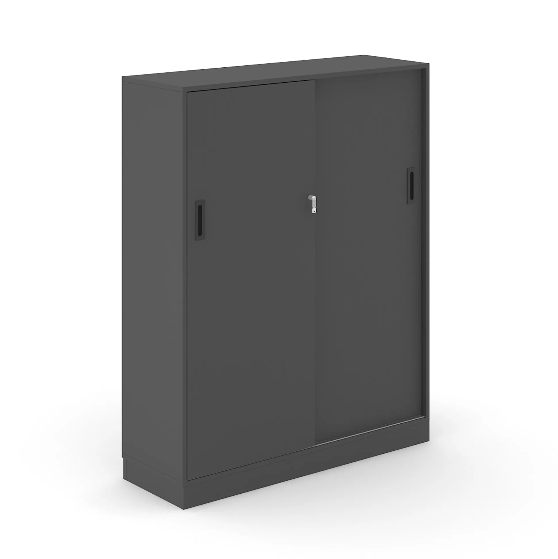 New Choice skydedørsskab med 8 rum og skydelåger med lås. Skabet er udført i slidstærk decor laminat, og fås i flere forskellige størrelser. Det er perfekt til opbevaring af diverse mapper og andet, og fungerer også som rumdeler imellem arbejdspladser. Skydedørsskabet fås i antracit, hvid eller eg.